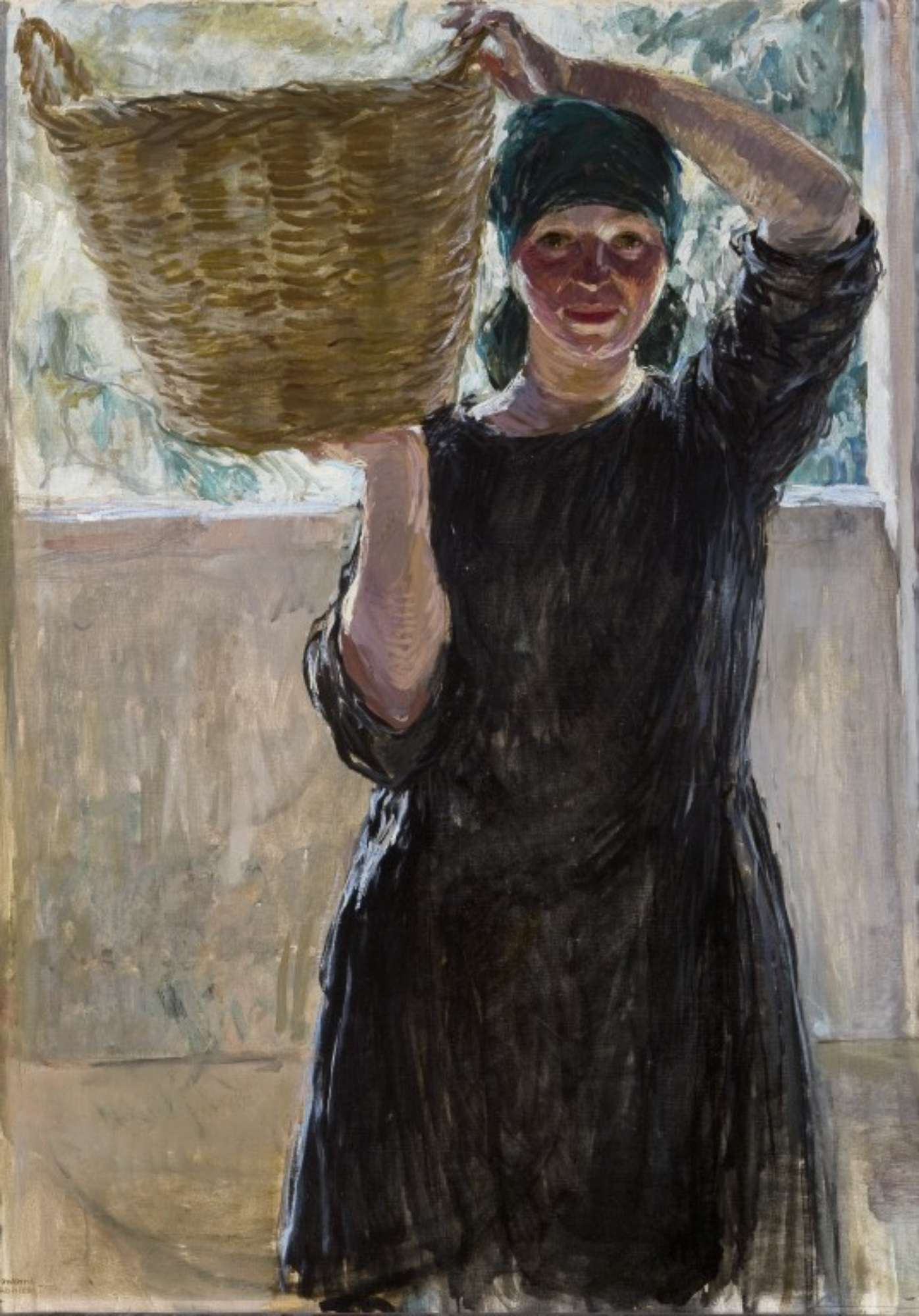 L'opera raffigura una giovane contadina con taglio a tre quarti, rivolta verso il riguardante, in atto di recare una cesta, che solleva con entrambe le mani all'altezza della spalla destra; la scena è ambientata in un interno rustico, che s'apre, forse con un loggiato, su un esterno luminoso con vegetazione.