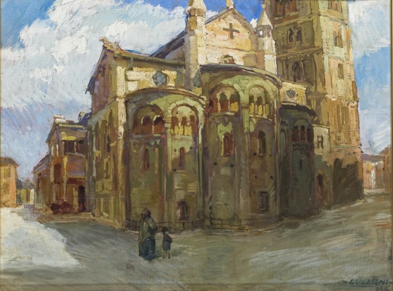 E' un saggio di vedutismo urbano che riprende il tema della piazza Grande, vero topos tematico per autori modenesi come Graziosi, Cappelli, Artioli, Jodi. Lucerni ne privilegia l'aspetto più evocativo, riducendo al minimo le presenze dei personaggi. L'attenzione dell'artista s'incentra sull'effetto luministico, con una tavolozza rischiarata probabilmente da influenze dall'ambito veneziano e dal coevo punto di stile di Mario Vellani Marchi.