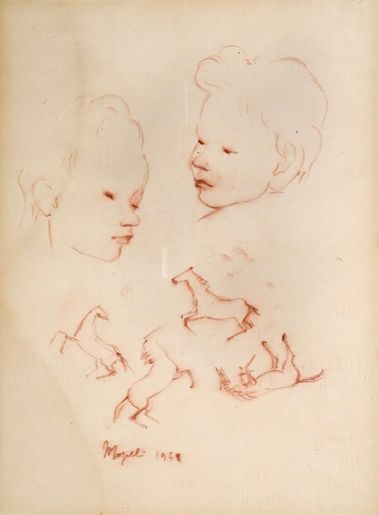 Il foglio presenta una serie di schizzi realizzati a sanguigna: due teste di bambini girate di tre quarti, quattro cavalli di profilo.