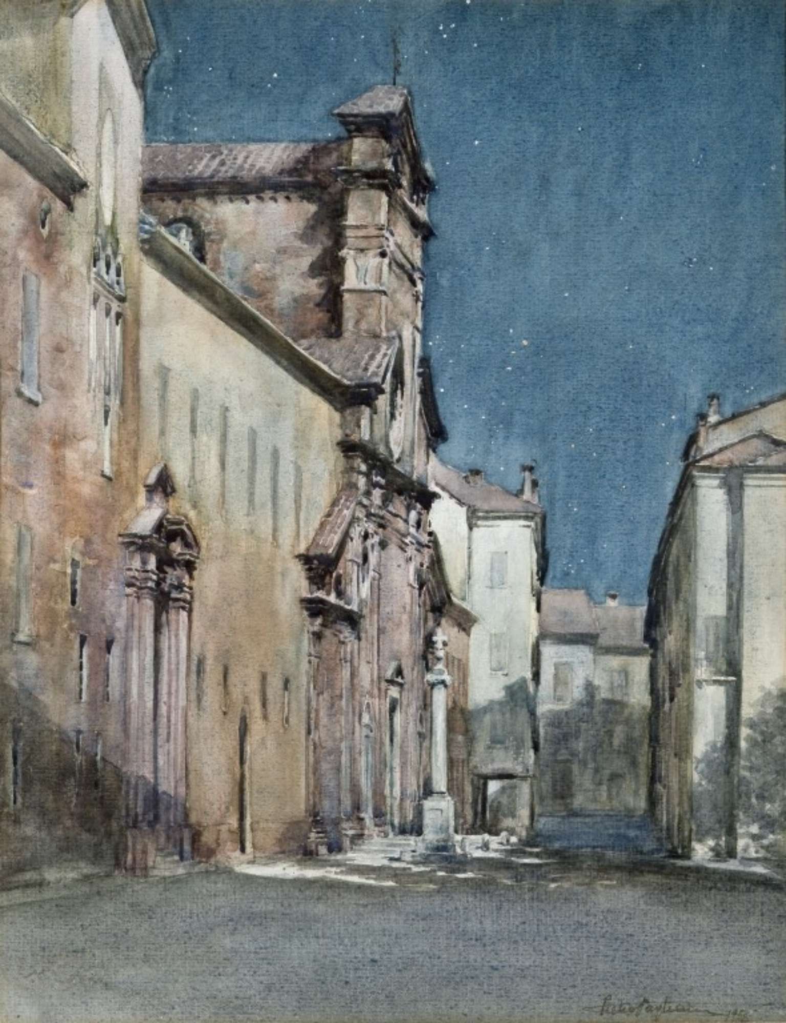L'opera fu acquistata dalla Provincia di Modena con deliberazione del 1954. Maestro assai apprezzato del vedutismo modenese dei due quarti centrali del '900, Pietro Pagliani ha all'attivo una nota serie di vedute delle chiese di Modena, trasposta in incisione. E' questa una delle prove più alte del vedutismo dell'artista, in un clima di notturnismo che accresce la poesia di questo scorcio di Modena antica, superando per personale interpretazione i modi del maestro Arcangelo Salvarani.