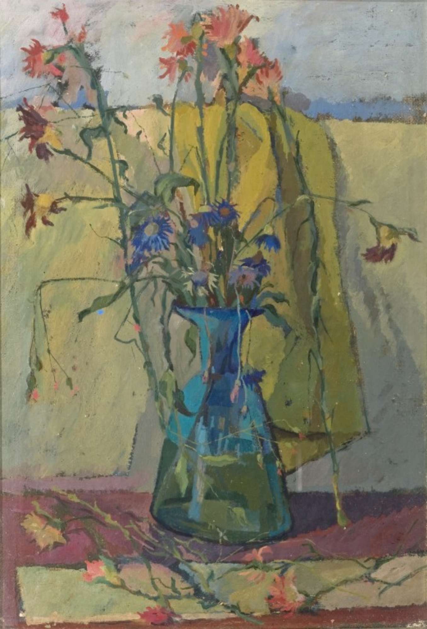 L'opera raffigura un vaso di vetro con fiori (garofani?) posato su un tavolo; alcuni fiori ricadono avvizziti, altri sono sparsi sul tavolo.