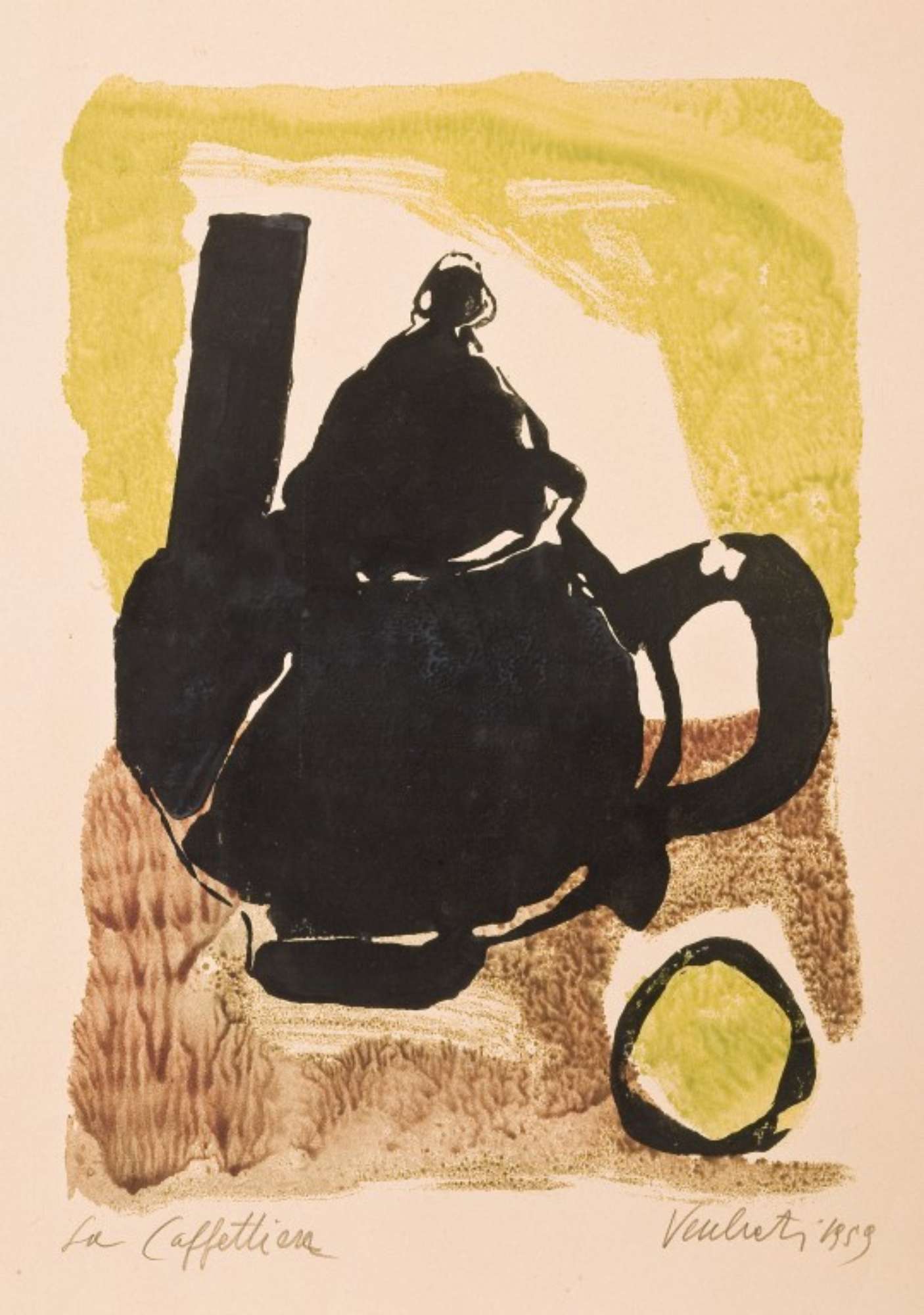 L'opera raffigura una caffettiera nera, con accanto un limone, in primo piano, sulla destra, entrambi su un tavolo, contro uno sfondo giallo.