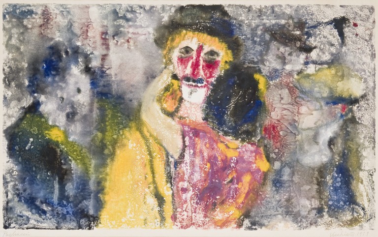 L'opera raffigura un pagliaccio dal viso dipinto a forti colori, in veste giallo-arancio, abbracciato da una figura femminile, forse una bambina, tra alcune figure sfumate, ai lati.