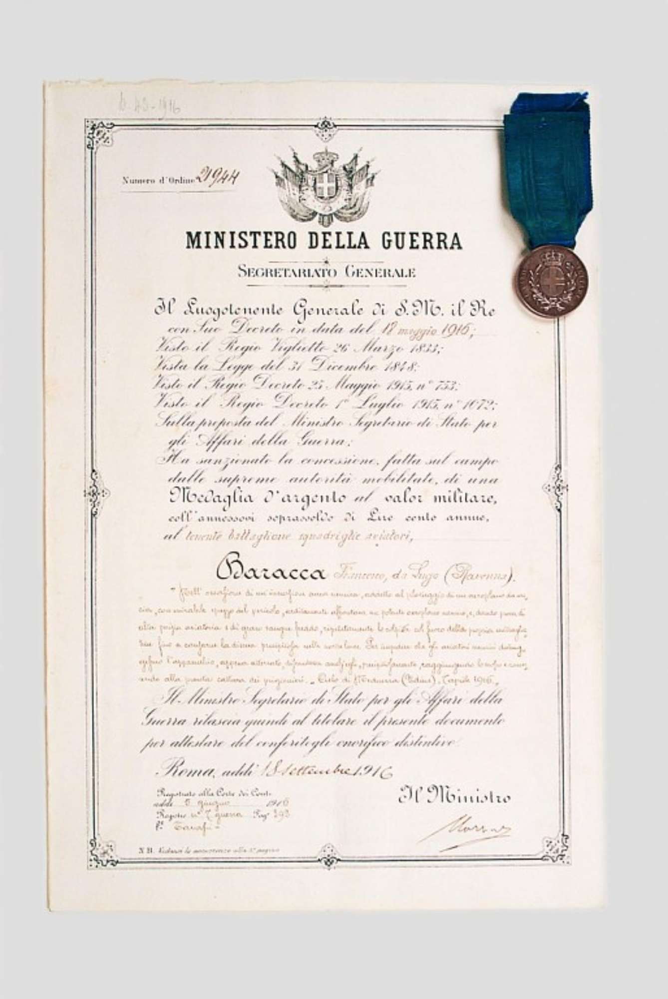 Attestato di conferimento della Medaglia d'argento al valor militare, con appuntata la medaglia e il nastro blu.