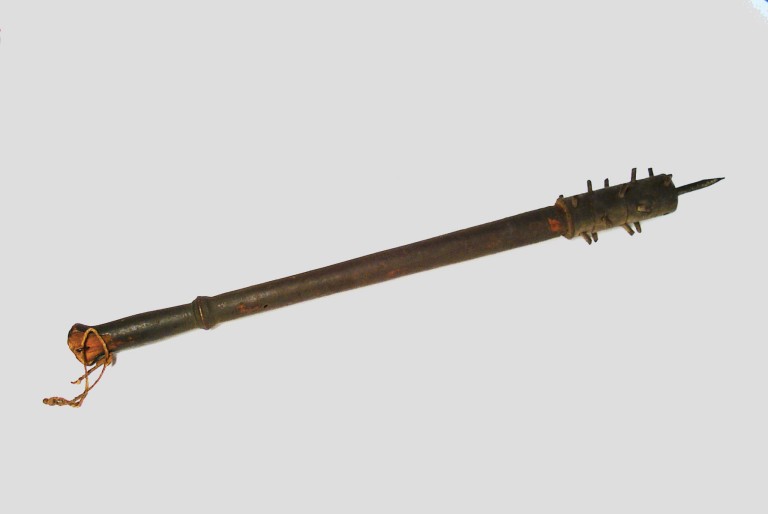 Mazza ferrata del tipo rigido. Corpo in legno tornito con foro per il passaggio del cordino di sicurezza. Cuspide a brocco in metallo e chiodi su tre ghiere metalliche.
