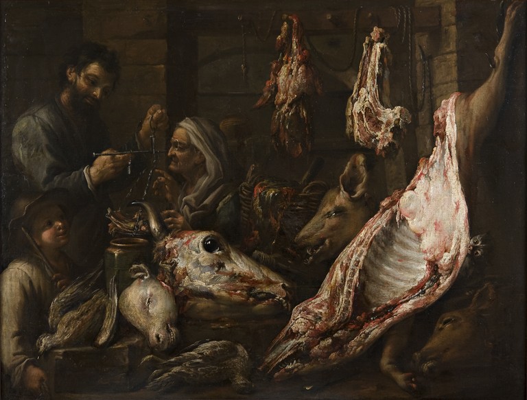 Ironico e allusivo il dialogo, fatto più di cenni che di parole, fra il macellaio bonario ed accomodante, e la vecchia diffidente, e arcigna: questa, poi, sembra fare tutt’uno con l’ammasso delle carni, con un sottointeso quasi macabro, sottolineato dalla testa sogghignante del maiale posto sulla stessa diagonale.