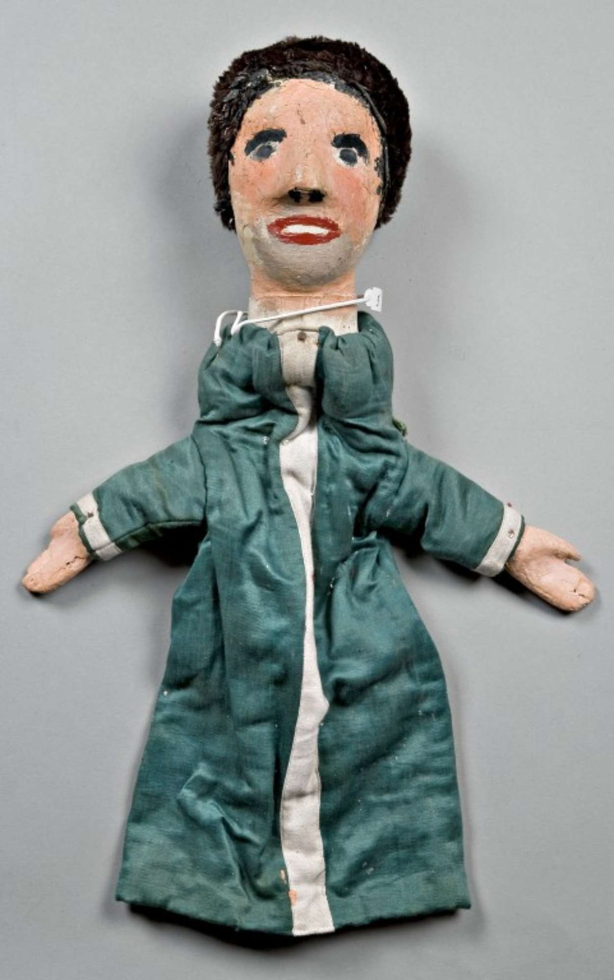 Burattino con testa di legno scolpito e dipinto. Le pupille sono dipinte di nero. I capelli sono di pelo animale. Le mani sono scolpite a tutto tondo. L'abito è di cotone verde, con passamanerie bianche.