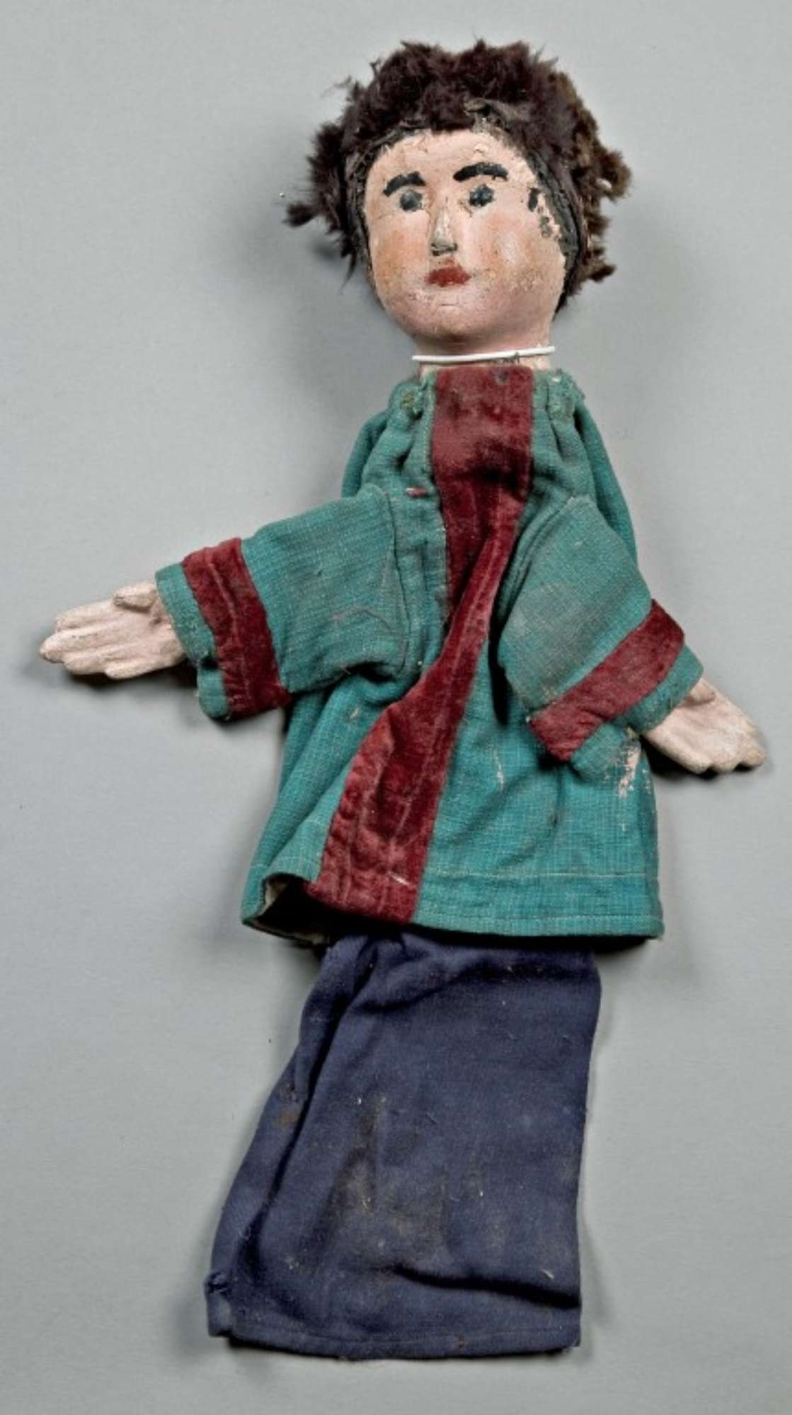 Burattino con testa di legno scolpito e dipinto. Le pupille sono dipinte di nero. I capelli sono di pelo animale. Le mani sono del tipo piatto, con dita incise. La giacca è di cotone verde, con passamanerie di velluto porpora.