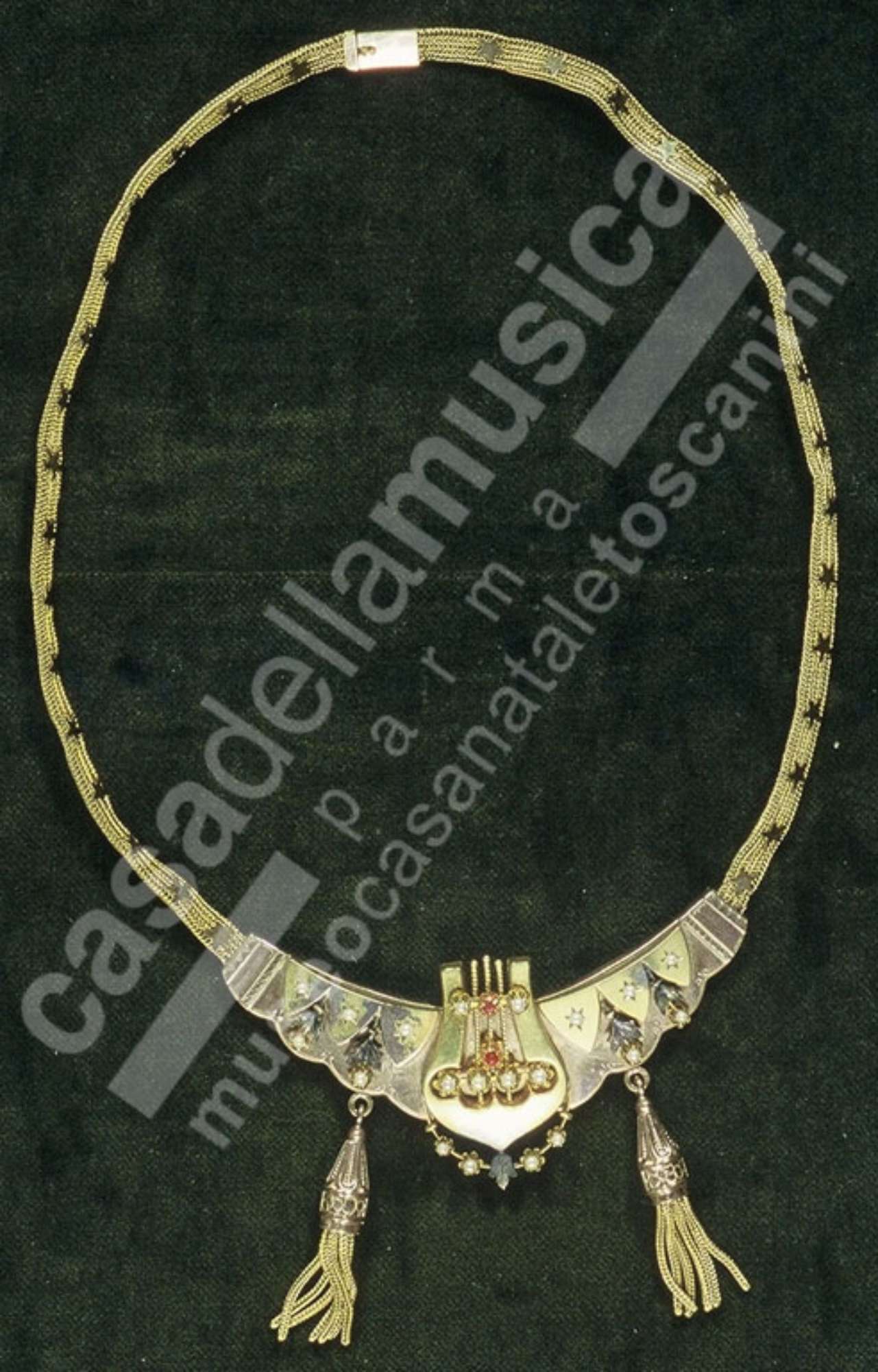 Collier con monile a mezzaluna, incastonato di quattordici perle e due rubini, con ornamento a forma di lira nel centro e due pendagli con peduncoli in oro filigranato. Catenina in oro filigranato decorata con stellette a cinque punte.