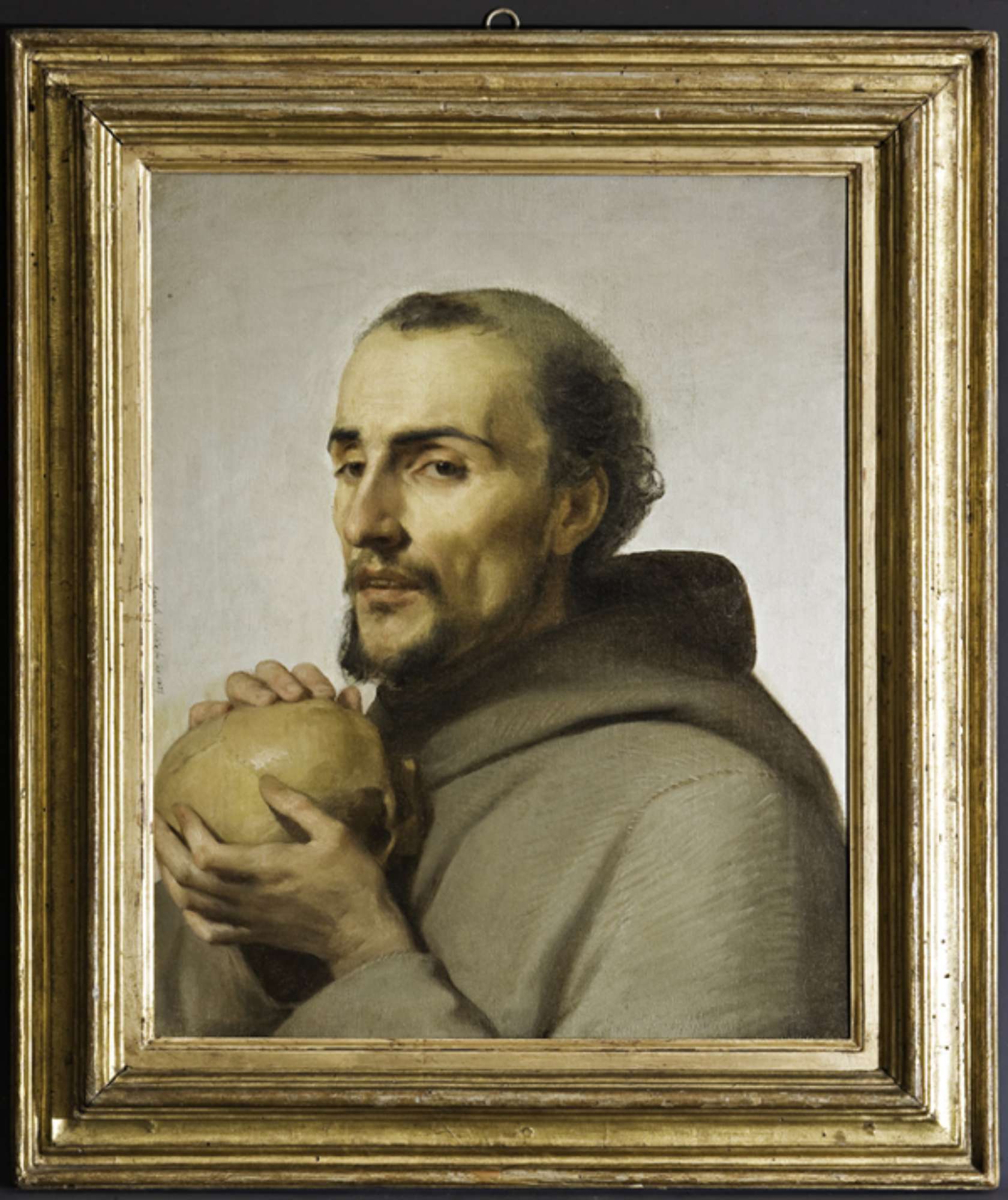 La tela dipinta a olio raffigura san Francesco d'Assisi in meditazione, è inserita in una cornice di legno intagliato e dorato.