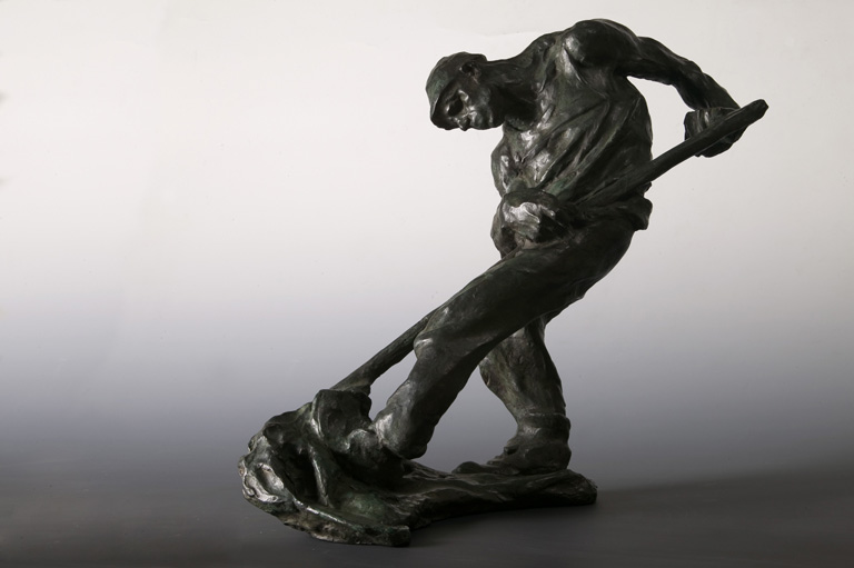 Scultura in bronzo raffigurante un contadino al lavoro con la falce.