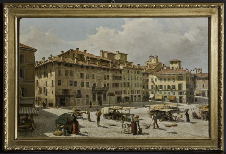 Dipinto a olio su tela raffigurante uno scorcio di Piazza Grande a Modena.