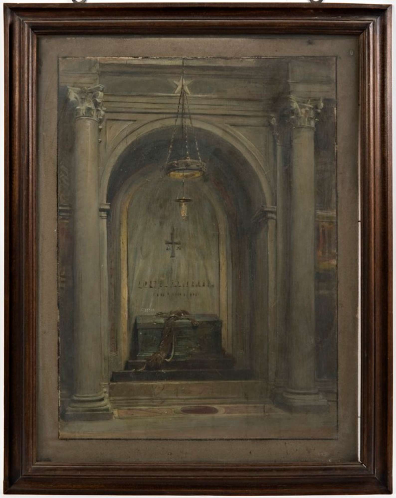 Primo progetto di Ludovico Pogliaghi per la tomba di L. A. Muratori. Cornice in legno intagliato.