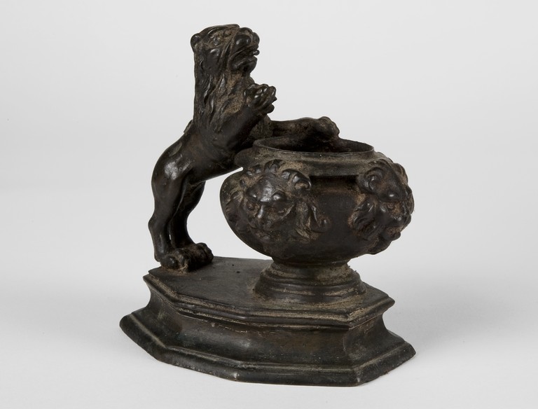 Calamaio da tavolo in bronzo (?) a patina scura su base poligonale a profilo concavo, effigiante felino in posizione eretta con zampa sinistra poggiante su di un cratere decorato a protomi leonine.