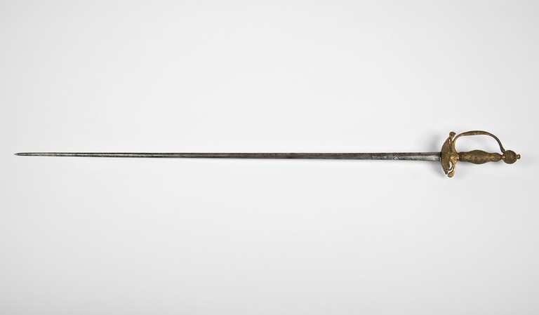 Fornimento in bronzo giallo, pomo sferoide con bottone. manica a rigonfio con gli stessi ornati del fornimento, guardia e braccio di parata lavorati come il resto. Doppia valva decorata.
