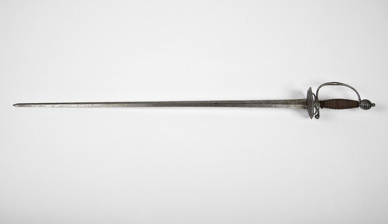 Spadino con fornimento in bronzo argentato, pomo sferoide traforato e bottonato. Impugnatura lignea affusolata con copertura in fili di ferro. Doppia valva piccola. Blocchetto poco sagomato, guardia stretta slargata al tratto intermedio, breve bulbo di parata e poco ricurvo in basso, archetti in semicerchio.