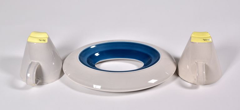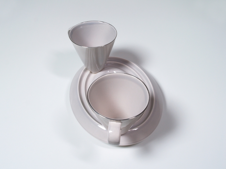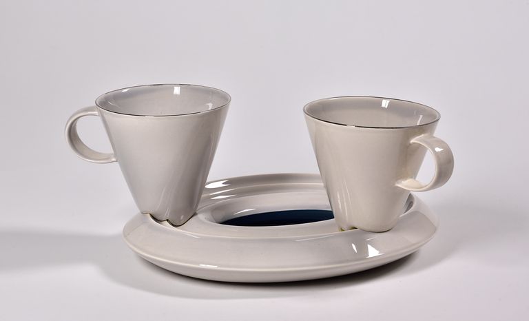 Due tazze di forma troncoconica con manico a nastro e filetto argentato al bordo. Il fondo delle tazze è sagomato in modo da restare in equilibrio su di una base ovale percorsa da due profonde scanalature. Vetrina grigia, sul fondo della base è applicata una vetrina blu mentre la base delle tazze è gialla matt.