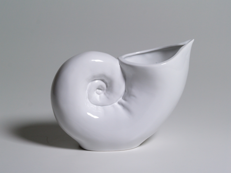 Versatoio a foggia di conchiglia in porcellana bianca.