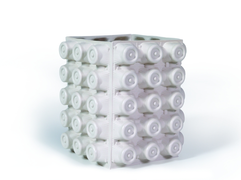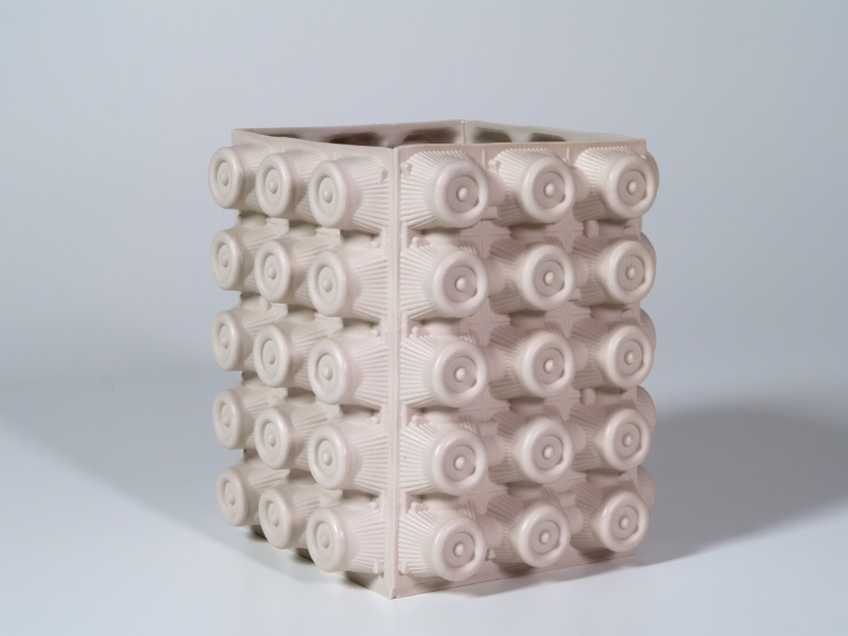 Vaso in grès a forma cubica. Le pareti esterne sono lavorate in rilievo a imitazione dei contenitori per uova.