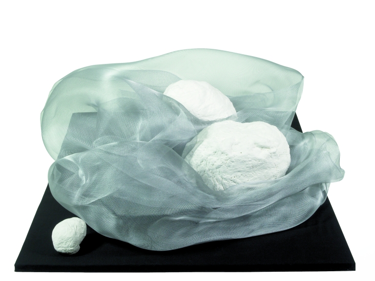 Su una base di legno rettangolare sono posti una rete metallica e tre elementi in porcellana dalla forma rotondeggiante irregolare, cavi all'interno. Due elemento poggiano sulla rete, mentre il terzo, di dimensioni inferiori, è posizionato sulla base.