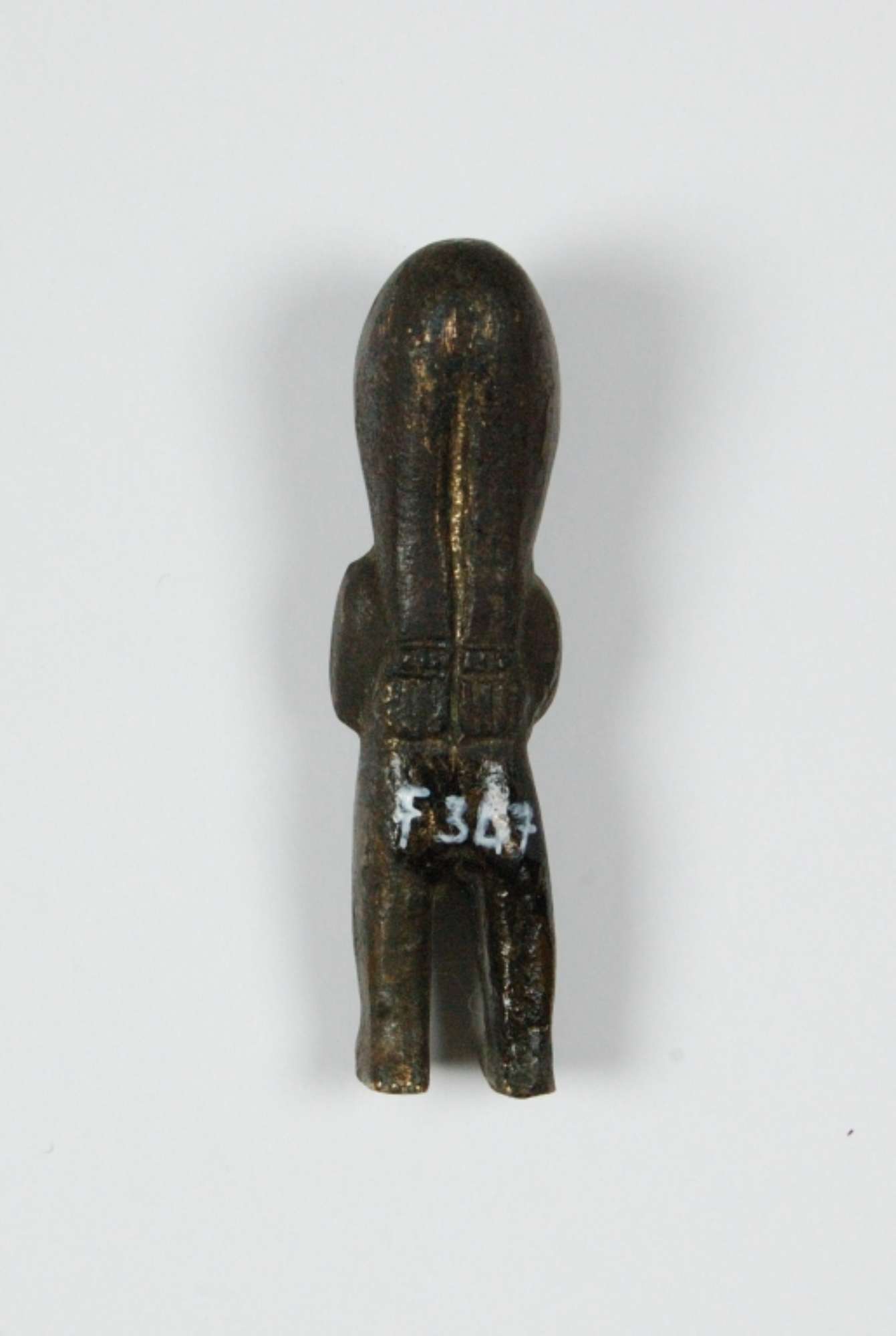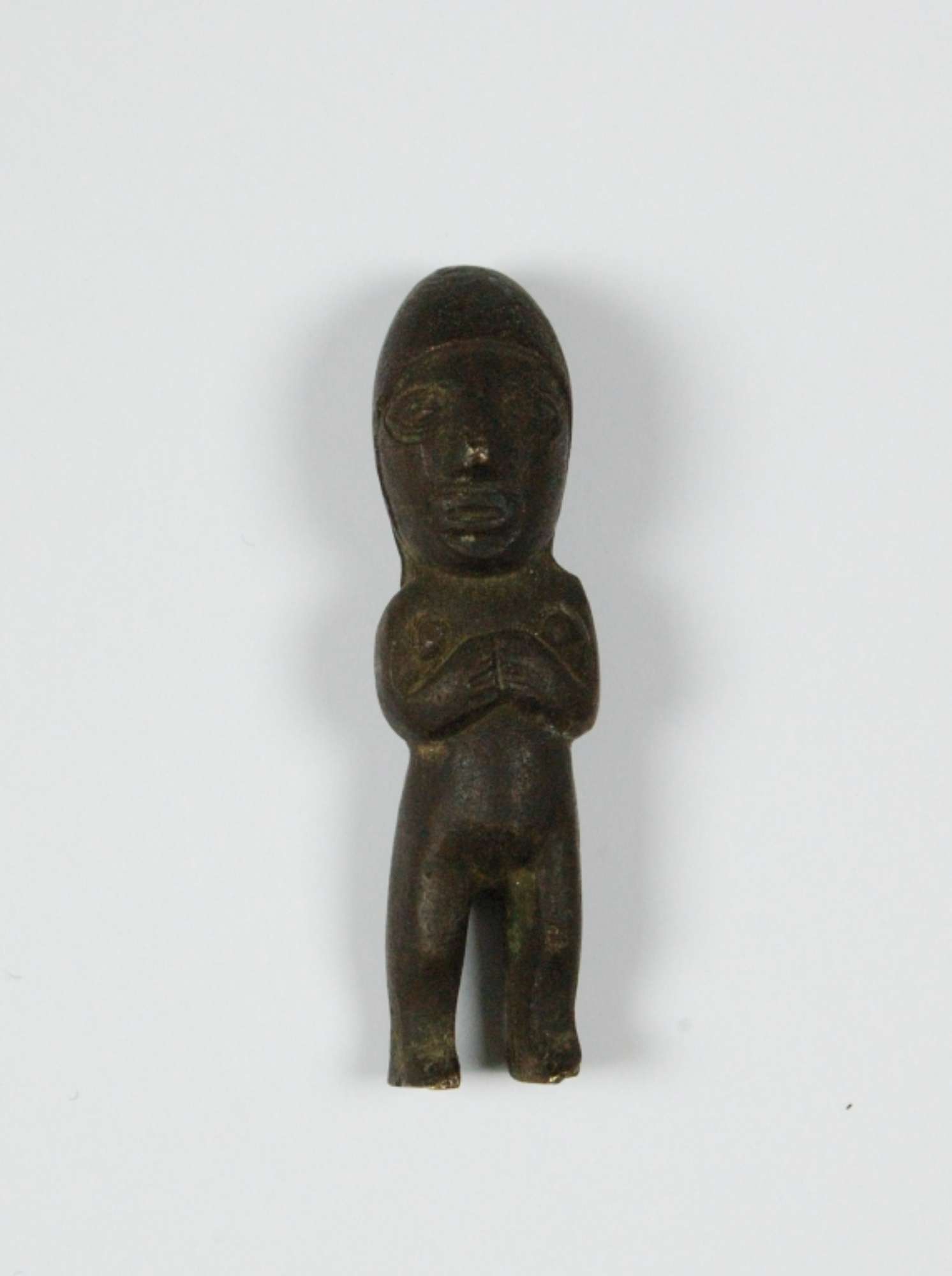 Figurina femminile nuda, piuttosto stilizzata, stante con le gambe leggermente divaricate e mani giunte tra i seni, testa modellata e incisa in rilievo, naso prominente, lunga capigliatura terminante nella parte retrostante in due 'trecce lisce' con due fermagli a frange, occhi e bocca semiaperta in rilievo. Bronzo di colore nero. Tecnica fusoria a cera persa.