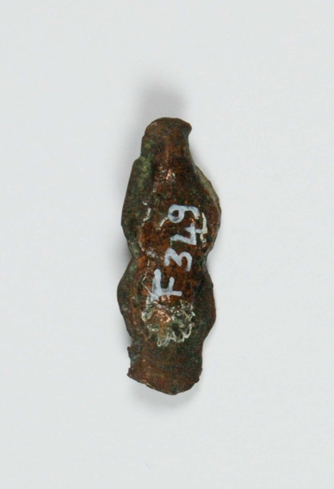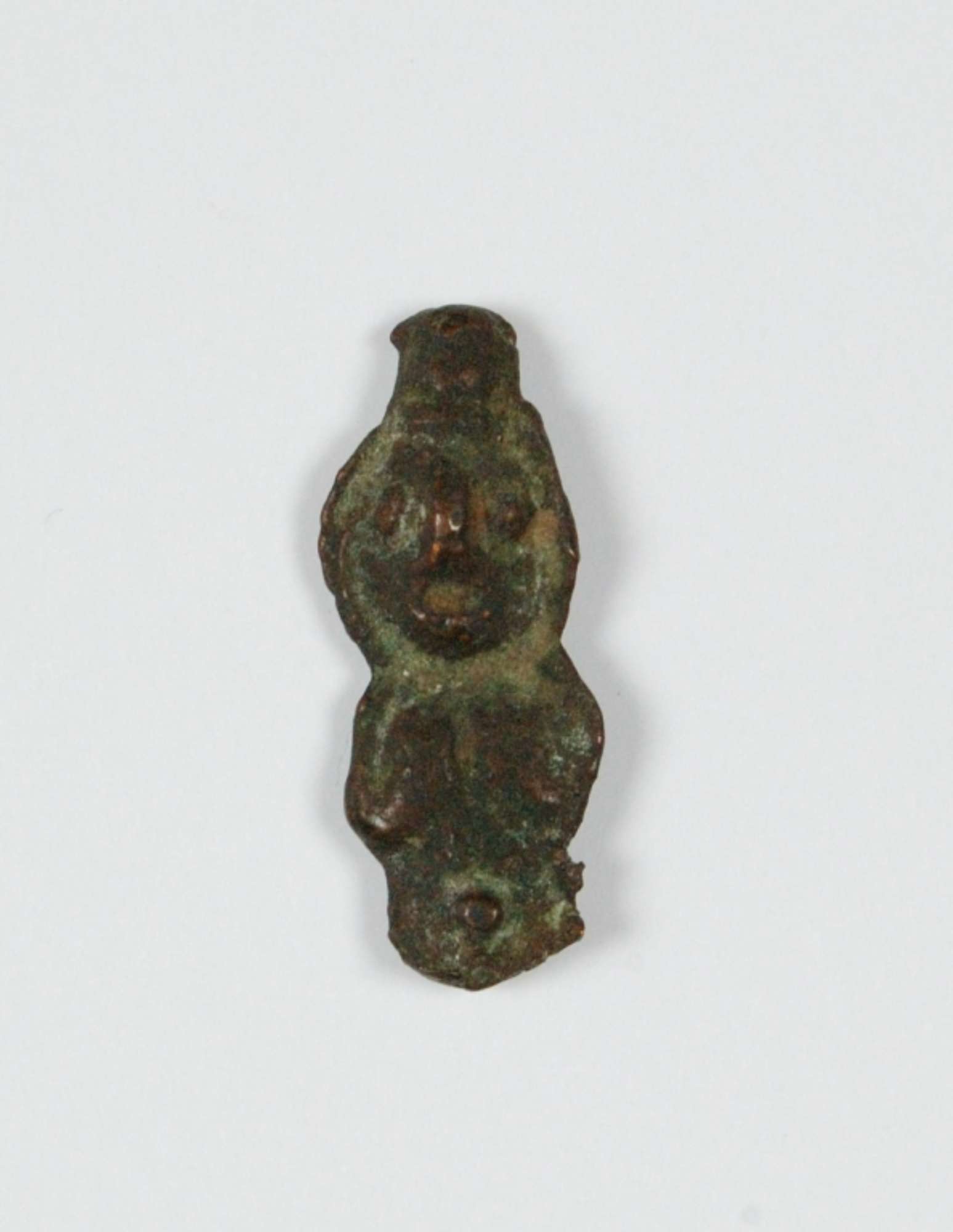 Figurina maschile nuda priva di gambe (inginocchiata?) stilizzata con copricapo o acconciatura conica e mani sul petto, retro piatto. Lega di rame fusa in stampo.