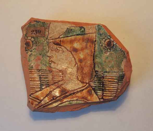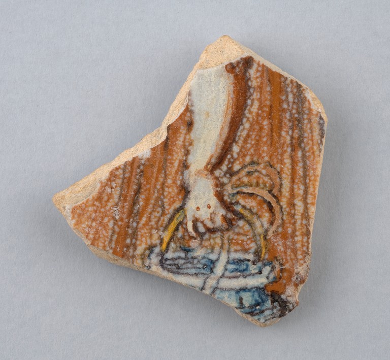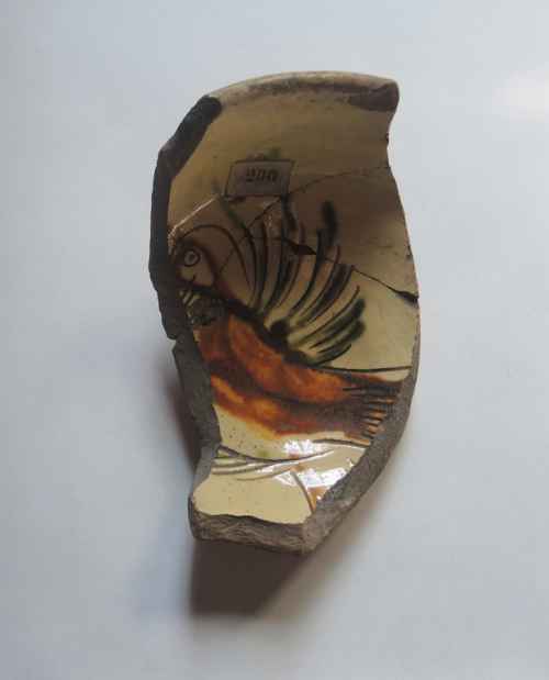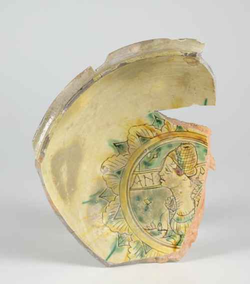 Ciotola (?) di maiolica rinascimentale istoriata. Fondo con piede ad anello. Dipinta da figura femminile con cesto. Esterno smaltato bianco e dipinto “a calza”.