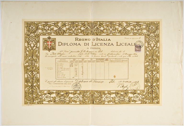 Diploma di Licenza Ginnasiale conferito a Italo Stegher (28 maggio 1894- 25 agosto 1917) e datato 21 settembre 1912. Nato a Civitavecchia, ma residente a Forlì dal 1905, Stegher partecipò alla Prima Guerra mondiale, quale Capitano della settima compagnia del 208° Reggimento Fanteria "Taro", morendo sull'Altopiano della Bainsizza, a quota 549, il 25 agosto del 1917: fu infatti colpito con una pugnalata alla testa durante un'incursione notturna di soldati austriaci, penetrati nelle nostre linee travestiti da soldati italiani. Fu decorato con la Medaglia d'argento al Valore Militare il 10 maggio 1916 perchè, seppur ferito durante un bombardamento nei pressi di Rovereto, tornò non appena medicato al comando della propria compagnia; per aver combattuto eroicamente nello scontro che lo portò alla morte fu invece decorato alla memoria con la Medaglia d'oro al Valor Militare il 19 agosto del 1921. Insieme ad altri cimeli conservati nella stessa vetrina, l'attestato fu donato dalla sorella del capitano in data non accertata.