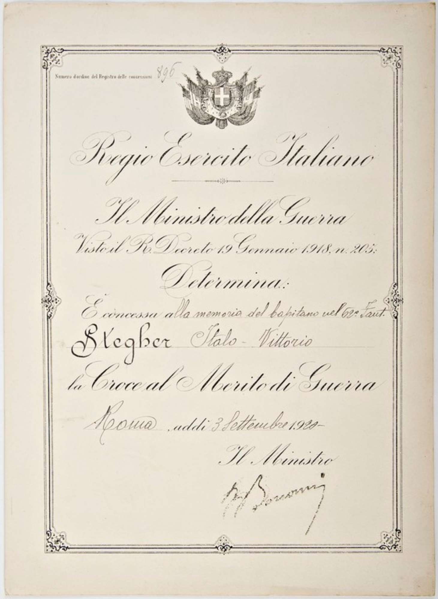 Diploma, datato 3 settembre 1920, per la concessione alla memoria al capitano Italo Stegher della Croce al Merito di Guerra, istituita con Regio Decreto il 19 gennaio 1918. Nato a Civitavecchia, ma residente a Forlì dal 1905, Stegher (28 maggio 1894- 25 agosto 1917) partecipò alla Prima Guerra mondiale, quale Capitano della settima compagnia del 208° Reggimento Fanteria "Taro", morendo sull'Altopiano della Bainsizza, a quota 549, il 25 agosto del 1917: fu infatti colpito con una pugnalata alla testa durante un'incursione notturna di soldati austriaci, penetrati nelle nostre linee travestiti da soldati italiani. Fu decorato con la Medaglia d'argento al Valore Militare il 10 maggio 1916 perchè, seppur ferito durante un bombardamento nei pressi di Rovereto, tornò non appena medicato al comando della propria compagnia; per aver combattuto eroicamente nello scontro che lo portò alla morte fu invece decorato alla memoria con la Medaglia d'oro al Valor Militare il 19 agosto del 1921. Insieme ad altri cimeli conservati nella stessa vetrina, l'attestato fu donato dalla sorella del capitano in data non accertata.