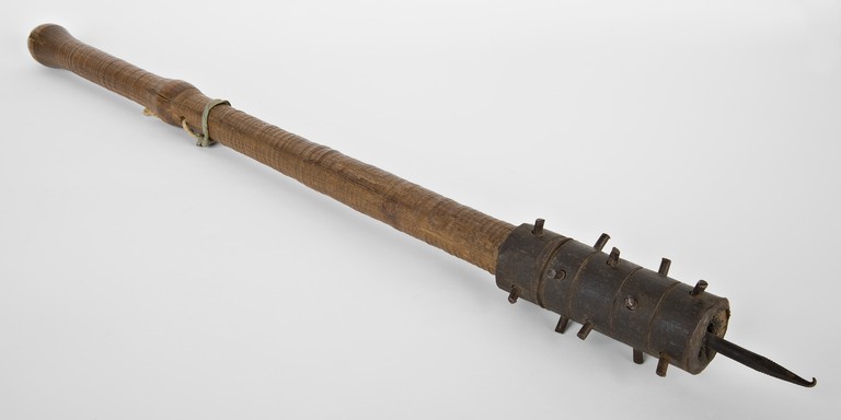 Arma da botta in dotazione all'esercito austro-ungarico durante il primo conflitto mondiale. L’inizio della guerra aveva trovato gli eserciti impreparati ad affrontare la realtà della guerra di posizione in trincea, essendo dotati di equipaggiamenti e armi che mal si adattavano ai feroci combattimenti corpo a corpo negli spazi ristretti della trincea. Questa carenza portò al ritorno sui campi di battaglia, dopo circa tre secoli di inutilizzo, della mazza ferrata quale arma d’assalto. Ne furono costruite innumerevoli varianti, sia dagli Austroungarici e Tedeschi che dagli Anglo-francesi, mentre la mazza ferrata non entrò mai in uso presso l’esercito italiano. Il primo utilizzo delle mazze sul fronte italiano sembra sia avvenuto durante la battaglia del Monte S. Michele del 29 giugno 1916, quando i reggimenti ungheresi della 7ª e 20ª Honved fecero uso delle mazze per finire i soldati italiani in agonia per i gas asfissianti. La mazza ferrata venne per questo motivo strumentalizzata dalla propaganda italiana, diventando "l'arma dei barbari" e quindi il simbolo della ferocia dell' esercito austro-ungarico. Il modello di mazza ferrata in esame fu fabbricato in serie utilizzando gli involucri della bomba a mano LAKOS, ritirata dal fronte a causa dei frequentissimi scoppi prematuri.