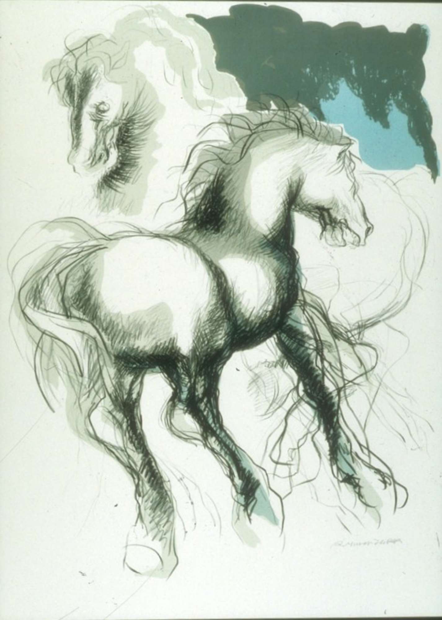 Cavallo in primo piano al galoppo da sinistra a destra; dietro la testa di altro cavallo. In alto a destra macchia di cielo azzurro