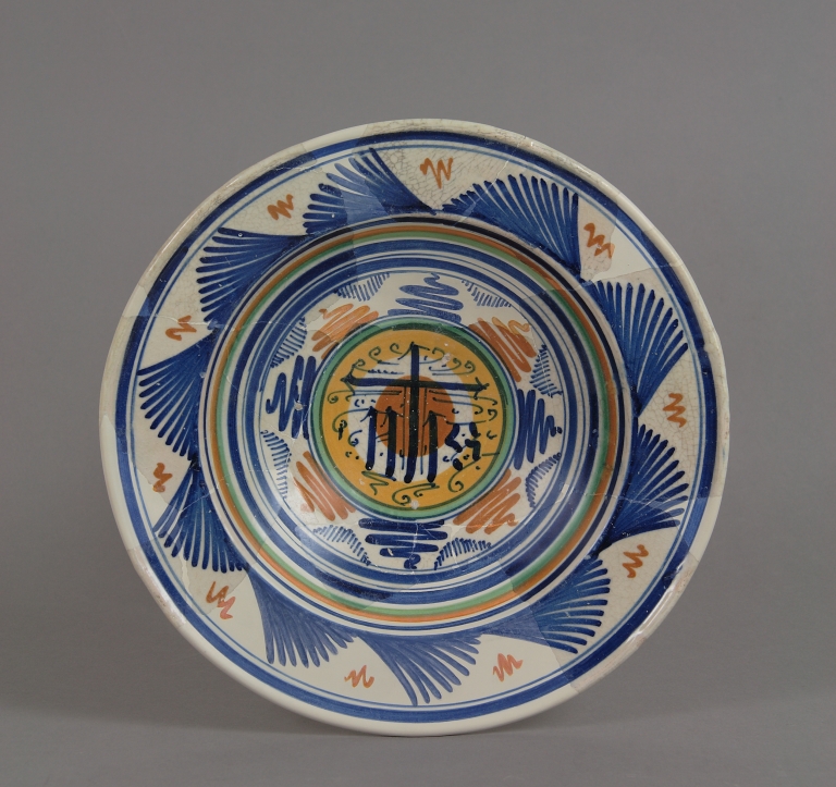 Piatto carenato con piede ad anello, profondo cavetto, ampia tesa leggermente obliqua con orlo arrotondato. Sul recto, al centro, medaglione con monogramma "IHS" delimitato da "raggiera bernardiniana"; lungo la tesa, semipalmette a ventaglio. Dipinto in blu, arancio, giallo e verde.