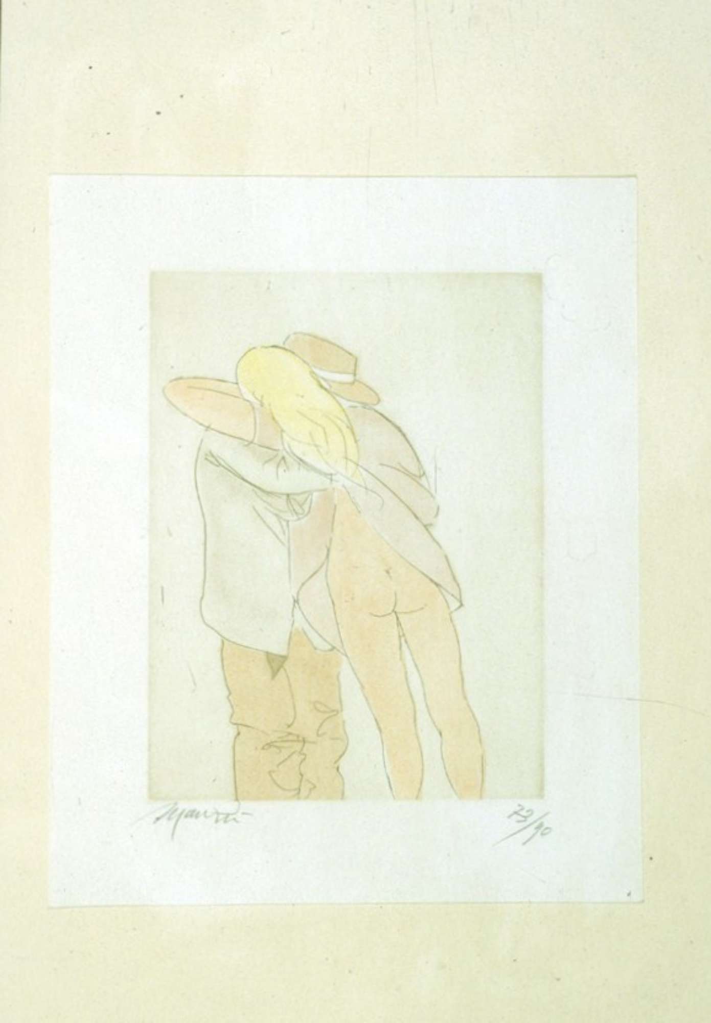 Abbracciati uomo vestito con cappello e donna seminuda con camicia bianca su fondo grigio perla.