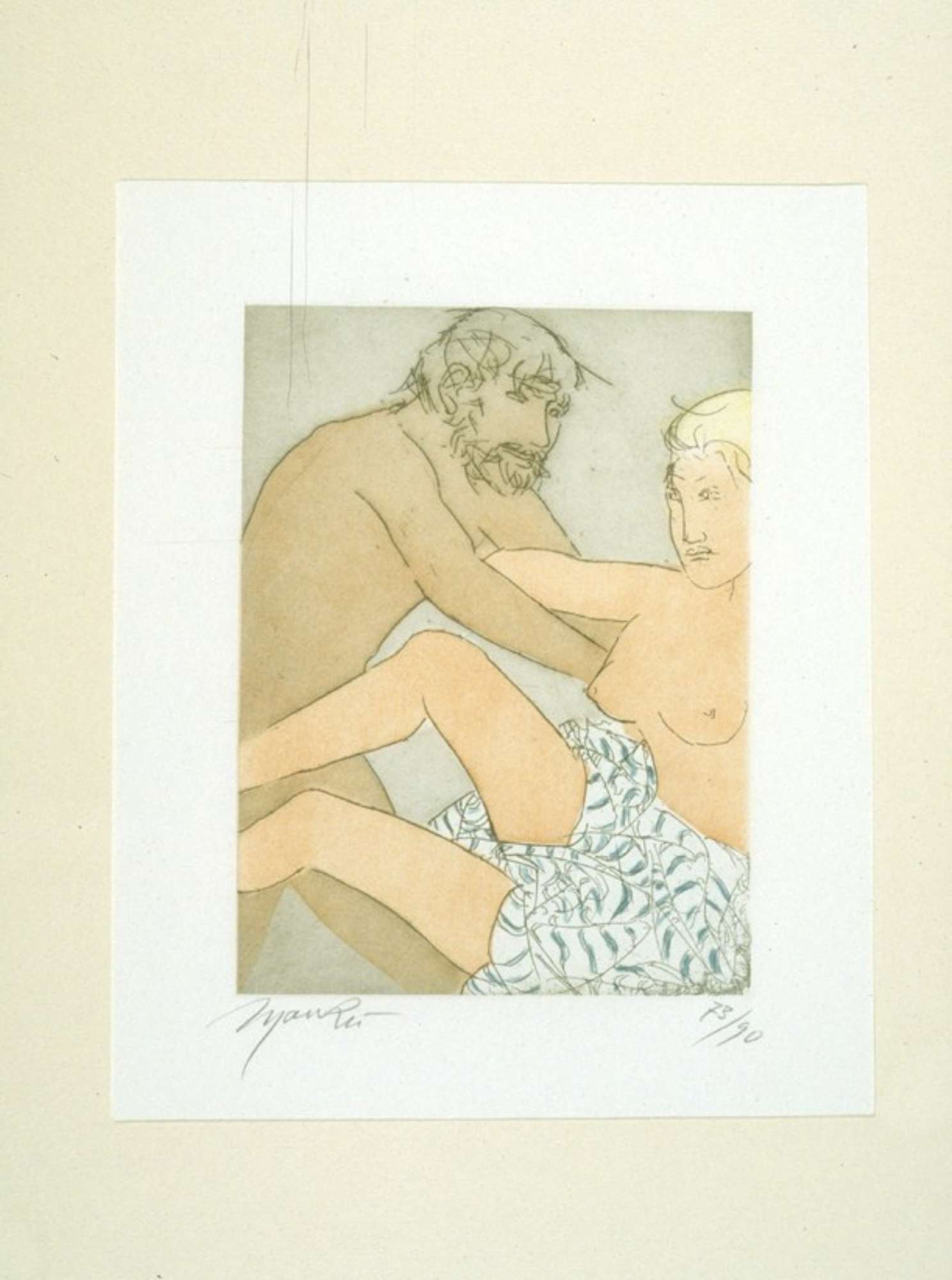 Uomo a destra, completamente nudo, accanto a donna a seno scoperto con veste ornata con motivi azzurrognoli su ginocchia. Fondo azzurro chiaro.