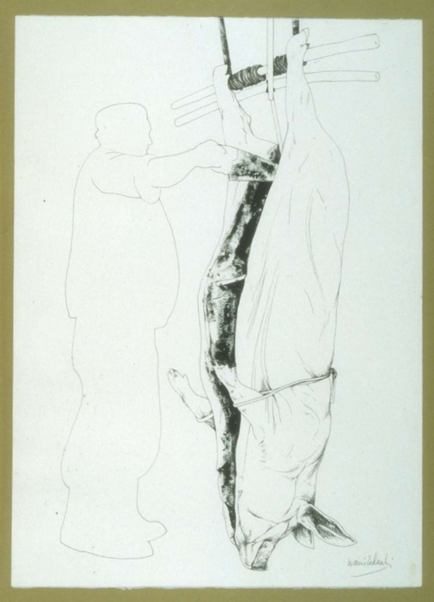 In primo piano la scena della macellazione del maiale; a sinistra una figura in piedi, a destra la bestia sventrata appesa a testa in giù.