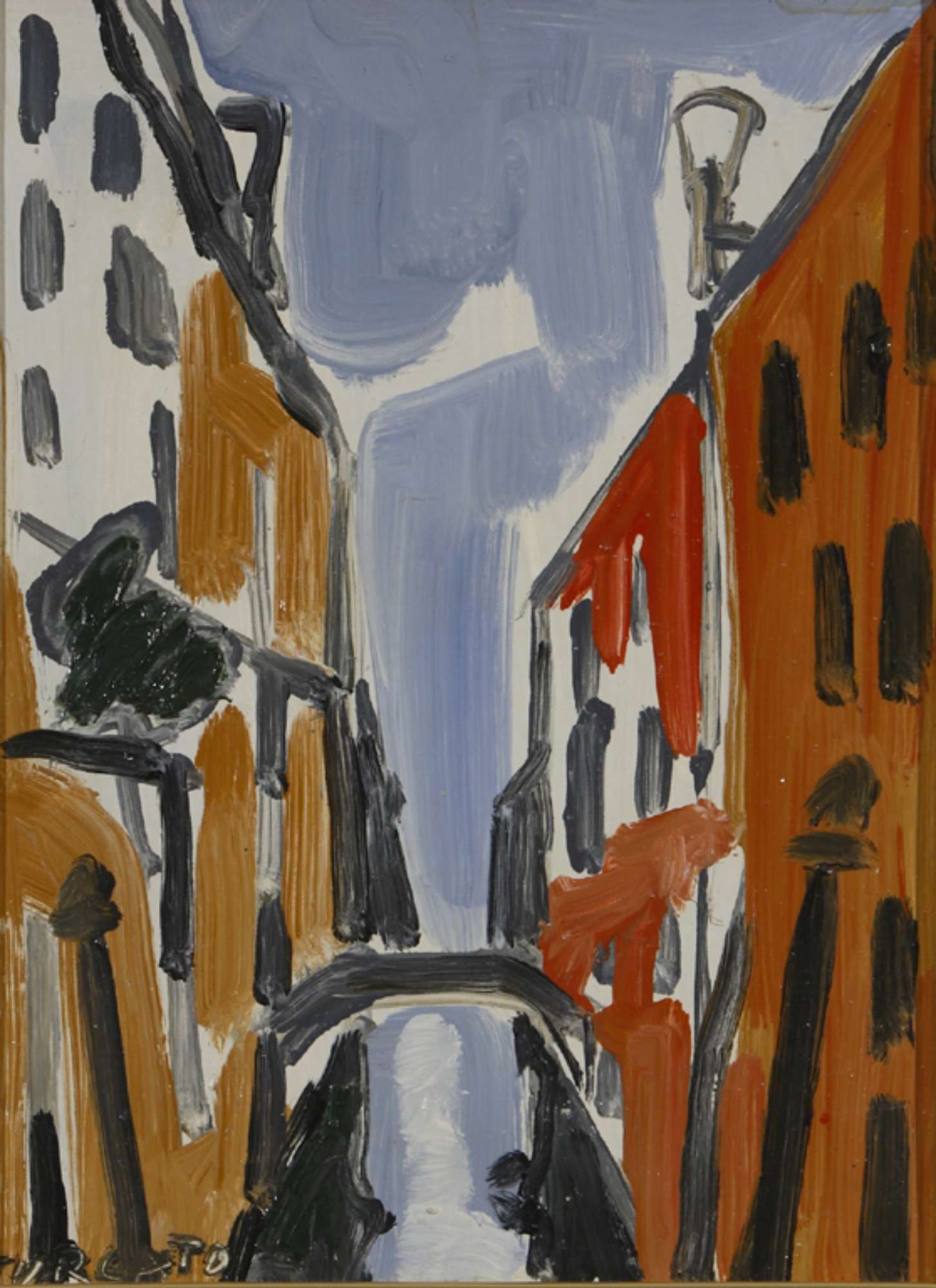 «Venezia stessa è una città tonale, e a uno come me, che ha dipinto paesaggi di Venezia fin da ragazzo, questo rimane conficcato dentro. Del resto il colore, qualsiasi colore, non può non essere anche trasparente, anche quando è intenso, altrimenti diventa una mattonata. Lo sapeva bene anche Matisse» (G. Turcato in F. GUALDONI 1982, p. 74). Venezia e Matisse sono, infatti, i fulcri su cui si basa la creazione di questa veduta di una calle lagunare, caratterizzata da elementi tipicamente veneziani: il canale, il ponte che l’attraversa e il comignolo svettante nel cielo: tutti simboli che fin dall’epoca dei teleri dei Bellini e di Carpaccio immergono il riguardante, senz’ombra di dubbio, nel cuore della “venezianità”. Si tratta, infatti, di una tipica veduta urbana, senza personaggi e forme viventi, che se da un lato richiama le opere dei grandi vedutisti settecenteschi, dall’altro assorbe le novità della scuola francese dei Fauves per proporre un’idea non consueta per il vedutismo veneto. Eliminando dalla scena qualsiasi riferimento alla vita animata, togliendo quindi al dipinto la valenza di “scena di genere”, sono gli elementi urbanistici stessi a esser resi vitali attraverso il tratto della pennellata ed il colore. Proprio nel 1950, infatti, Turcato, dopo una lunga formazione lagunare, approda per la prima volta nella capitale della Francia, dove viene a diretto contatto con le cromie di Matisse. «Qualcosa di Matisse avevo già visto a Venezia, e a Parigi ho avuto modo di capire pienamente la sua ricchezza […] il disegno deve essere ridotto all’osso, fino a diventare segno, cioè un’altra cosa. Che la visione è un’esperienza complessa di cui si deve restituire un certo amalgama. Matisse vede i particolari coloristici, emotivi, non quelli descrittivi» (ivi, p. 72). La scarnificazione del tratto apre la composizione verso due strade: nella prima è il colore stesso a unire e disporre prospettivamente le architetture; nella seconda le singole pennellate conferiscono all’insieme il giusto movimento. Si potrebbe dire, paragonando questo dipinto alla musica, che la “tonalità” è data dalla scelta coloristica, mentre la parte ritmica passa attraverso il segno. La scena si apre e si muove quasi danzando, in uno spazio dove gli edifici, nelle loro angolazioni acute e ottuse formano accordi contrapposti, uniti solo dal ponte che, per l’appunto, collega armonicamente le due sponde passando sulla zona “neutra” (azzurro-grigia) del mare/cielo infinito. «Ci importava capire che il quadro non è basato su una formulazione statica, ma si muove […] attraverso una serie di tensioni. D’altronde questi schemi io li vedevo già da un po’ in certe cose del passato, a Venezia. Pensa ai Tintoretto di San Rocco, in cui tutto è giocato formalmente su costruzioni di movimento» (ivi, p. 68). Il movimento è, quindi, creato attraverso pennellate esatte e sicure come quelle utilizzate nell’arte grafica giapponese, dove l’andamento delle setole produce non solo segni, ma soprattutto emozioni. Come seppe rilevare a suo tempo Lionello Venturi, Turcato e gli artisti italiani dei primissimi anni Cinquanta, non volendo essere né astrattisti né imbrigliati nel puro realismo, «rimangono fedeli al principio, che è essenziale per l’arte moderna, e cioè che una pittura vale anzitutto per le sue linee, per le sue forme e per i suoi colori, per quella coerenza di visione che è l’intima forza di ogni opera d’arte dipinta» (L. VENTURI 1952, pubblicato anche in F.GUALDONI, cit., pp. 120-121).