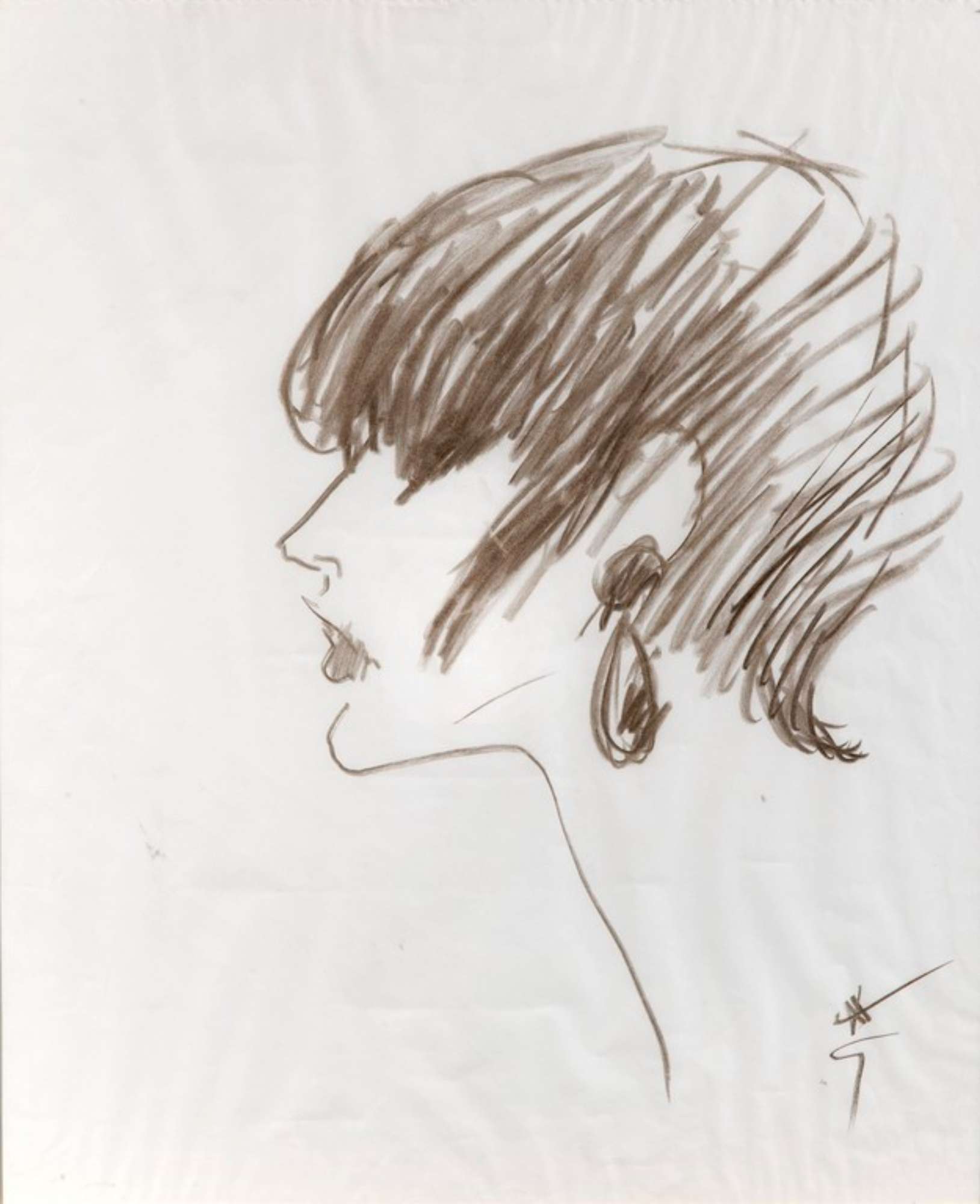 Profilo femminile con capelli neri corti e orecchino a goccia
