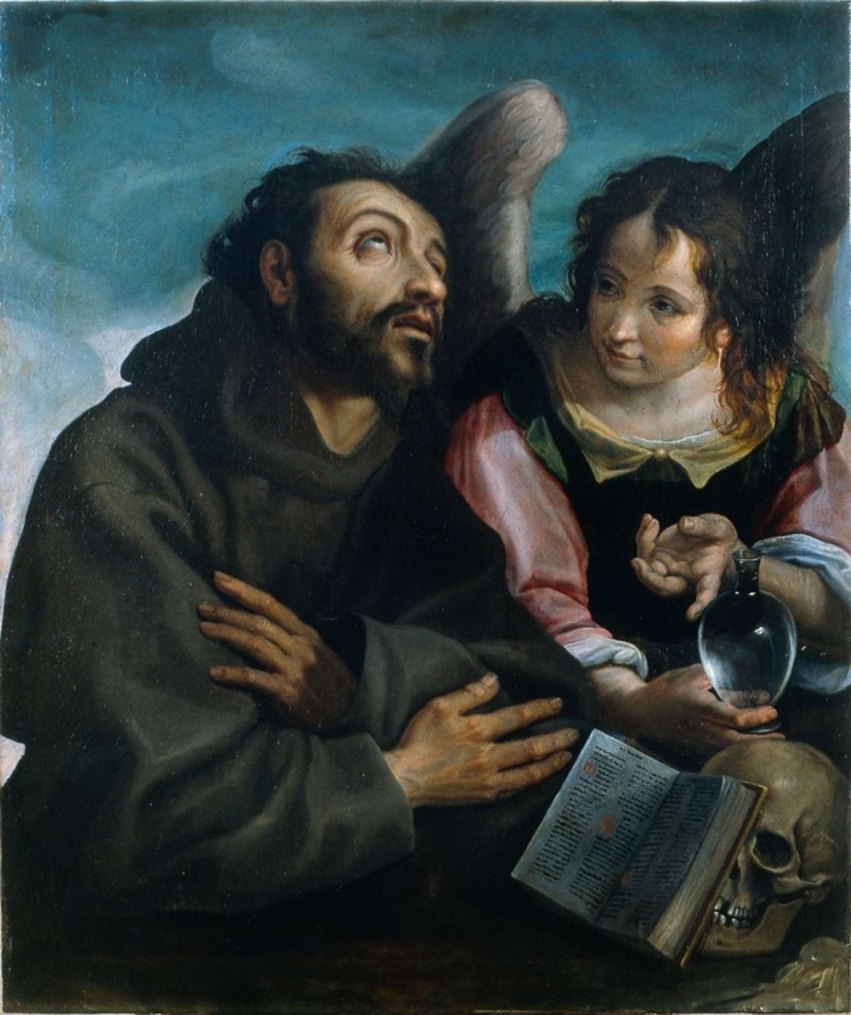 È identificabile con un San Francesco “di mano di Ercole dell’Abate” che, insieme al San Giovanni Battista di Bartolomeo Schedoni (n. 30), pervenne nel 1623 al Palazzo Comunale per lascito testamentario di Giovanni degli Erri (ASCMo, ExActis 1623, 20 gennaio, 361). Nel 1627 entrambi i dipinti sono ricordati, ma senza attribuzione, in un inventano di Robbe della Comunità di Modena (ASCMo, Ex Actis 1627, 3 gennaio 1625). Nel 1878 venne depositato al Museo Civico (ASCMo, Rag., Libro Casermaggio ed alloggi militari, c. 146; AMCMo, Atti 1878, prot. n. 1985 del 21 settembre), dove rimase fino al 1984. L’alta qualità è stata messa in luce da un restauro (1975) al quale ha fatto seguito la pubblicazione da parte di Gabriella Guandalini, secondo la quale il dipinto esemplificherebbe il superamento della fase schedoniana e mostrerebbe gli sviluppi dell’artista in direzione bolognese. All’interno della produzione di Ercole dell’Abate il dipinto costituisce in effetti un unicum di cui danno solo in parte ragione le sue altre opere note — per lo più pale da altare — connotate da un pletorico manierismo. I confronti più probanti sono peraltro proprio con il Sacrificio di Menecio Tebano dipinto nel 1606 per la sala del Consiglio Vecchio in Palazzo Comunale, all’interno dell’impresa che vede coinvolto anche il giovane Schedoni: il personaggio barbaro in basso a sinistra ripropone le sembianze di Francesco, anche se si connota per una resa complessivamente meno alta. Le osservazioni della Guandalini permettono comunque di intendere il carattere ambivalente, tra maniera e natura, che connota il dipinto, anche se i suoi aspetti più veri sembrano in realtà doversi leggere in direzione, più che dei Carracci, di Bartolomeo Passerotti