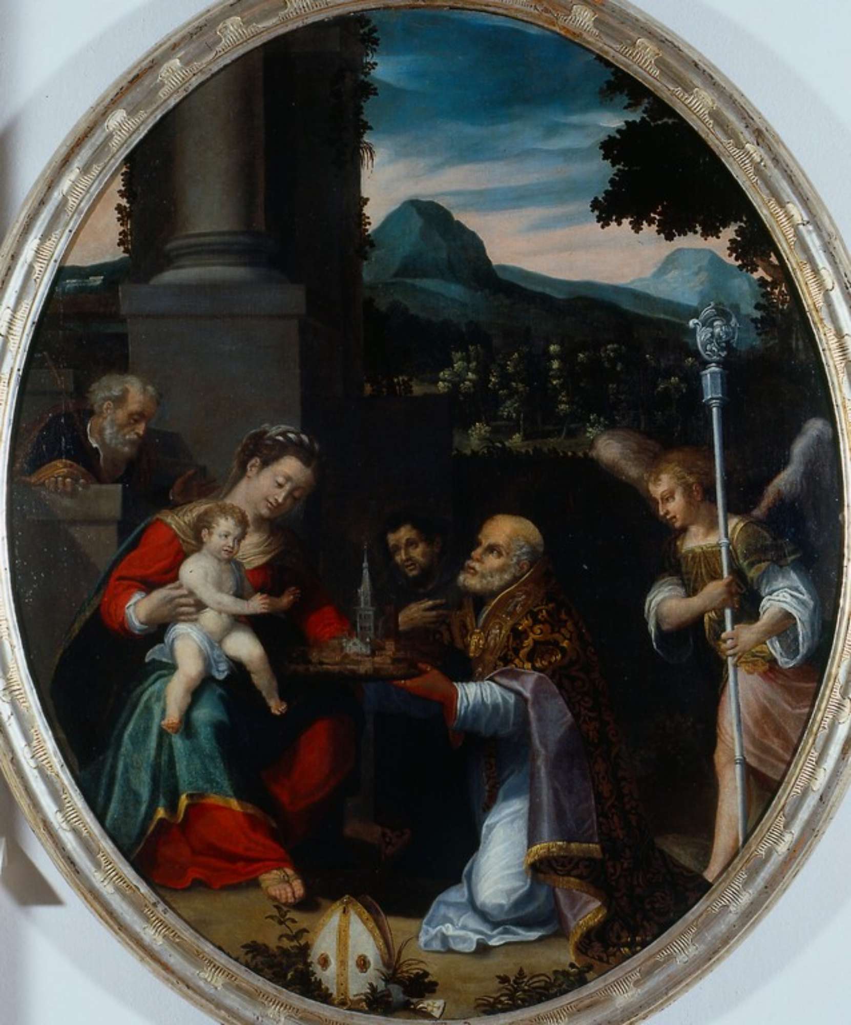 Il formato ovale è frutto di una decurtazione posteriore. L’attribuzione si deve a Ragghianti (scheda 1939/60). Pur con qualche incertezza, legata all’ancora lacunosa ricostruzione del percorso dell’artista, nipote di Nicolò dell’Abate, il riferimento sembra potersi accogliere alla luce del confronto con l’Annunciazione che Ercole eseguì per la chiesa di San Pietro di Modena nel 1603 (BENATI 1984, p. 113, fig. 113): si noterà infatti che la tipologia e l’abbigliamento della Vergine, memore di modelli passerottiani, compaiono inalterati in entrambi i dipinti e che lo scorcio del viso di san Geminiano, nel quadro qui considerato, torna alla lettera nell’angelo annunciante della pala di San Pietro. Inusuale appare altresì l’importanza conferita, aldilà della solenne quinta architettonica, all’ampio paesaggio montuoso, trattato con insolita naturalezza.