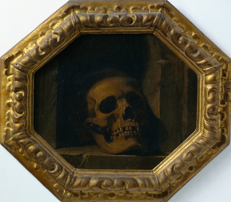 Il formato ottagonale e la particolare raffigurazione, con il teschio incassato entro una nicchia lascia immaginare che il dipinto fosse in origine destinato a figurare, più che autonomamente come “vanitas”, entro la cornice di una pala d’altare, come completamento iconografico, ad esempio, di una Crocifissione. In questa prospettiva, la tradizionale attribuzione a Lana, difficile da argomentare ma anche da smentire, appare indicativa quantomeno di una provenienza modenese. Il moderato naturalismo della stesura, latamente guerciniano (ma non a tal punto da autorizzare una diretta ascrizione del dipinto al Barbieri, come ha viceversa spericolatamente proposto Negro, per di più sulla base del confronto con una Vanitas in collezione privata svizzera, riprodotta in SALERNO 1988, p. 126, n. 48, a sua volta di assai dubbia pertinenza guerciniana), si unisce a una definizione preziosa ed elegante che non sconviene infatti alla produzione matura del pittore ferrarese.