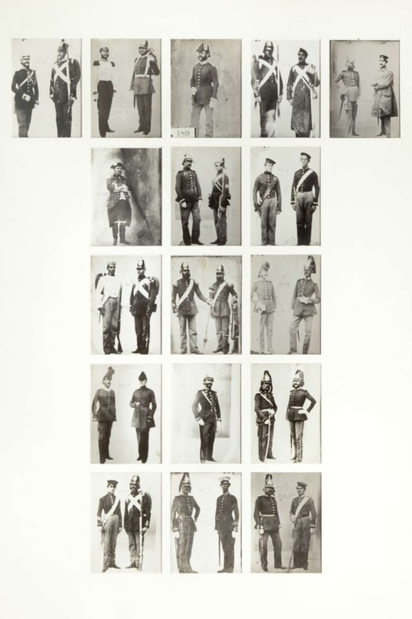Diciassette fotografie da dagherrotipi che raffigurano le uniformi dell'esercito borbonico: 1. Ufficiale e soldato della divisione di deposito; 2. Granatiere e caporale dei moschettieri-guardie; 3. Ufficiale di stato maggiore; 4. Granatieri in tenuta da campo; 5. Ufficiale di stato maggiore con feluca e aiutante di campo di S.A.R.; 6. Ufficiale superiore dei sedentari; 7. Moschettieri; 8. Guardie del corpo; 9. Granatiere e guardia ducale; 10. Militari appartenenti al corpo musicale; 11. Scrivani di fanteria e di artiglieria; 12. Ufficiali di stato maggiore; 13. Aiutante di campo di S.A.R.; 14. Militari del genio della compagnia zappatori; 15. Soldato in alta tenuta e sergente di fanteria in divisa da fatica; 16. Sottotenente in piccola tenuta e tenente in alta tenuta dei granatieri-guardie; 17. Ufficiali del genio.