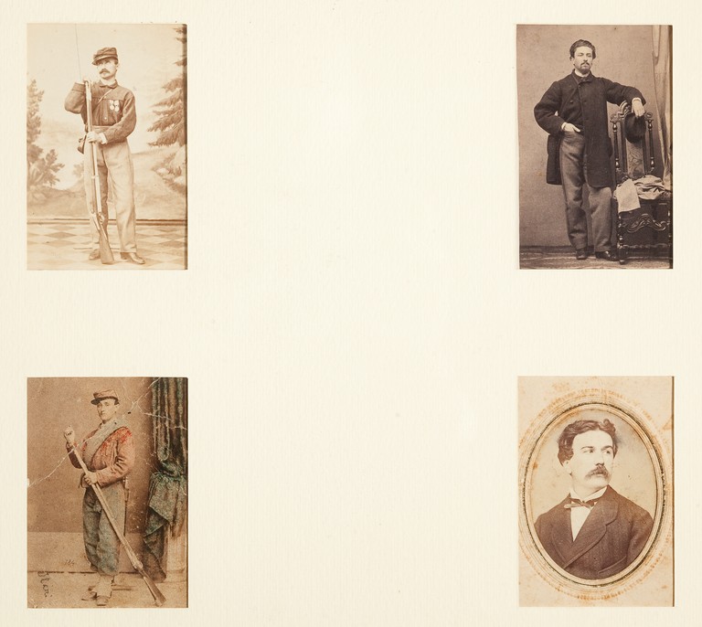 Quattro fotografe, formato carte de visite, dei volontari garibaldini fidentini a Mentana nel 1867: Ciro Bettati, Antonio Costa, Luigi Ilari e Luigi Musini.