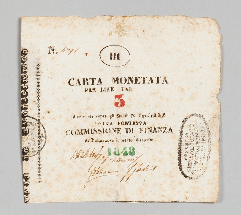 Il 17 aprile 1948 una colonna austriaca, comandata dal generale Nugent, investiva la Fortezza di Palmanova difesa dai militi della "Legione crociata" di Venezia. I difensori resistettero fino al 24 giugno. Durante l'assedio venne emessa una cartamoneta che aveva corso nell'interno della fortezza. Nella stampa su fondo bianco sono raffigurati i colori della bandiera italiana.