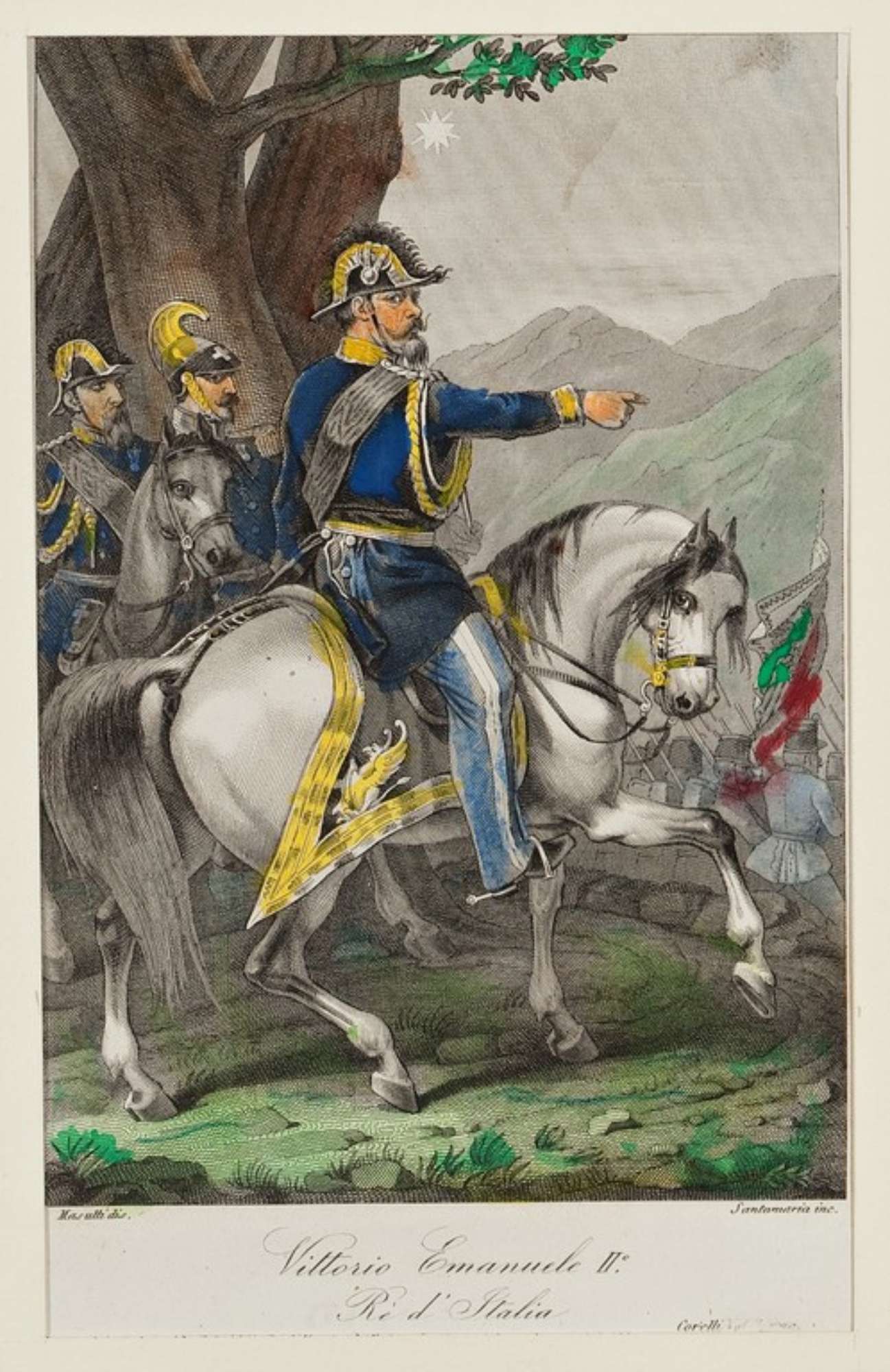 Vittorio Emanuele II (Torino 1820 – Roma 1878), figlio di Carlo Alberto, si distinse militarmente nella guerra del 1848. Dopo Novara raccolse l’eredità paterna, ottenendo un armistizio onorevole. Mantenne lo statuto distinguendosi in tal modo dagli altri principi italiani. Gli fu allora attribuito il titolo di “re galantuomo”, pur rimanendo la tentazione assolutistica una componente del suo comportamento. Riconoscendo i meriti di Cavour, si rimise alla sua politica pur continuando sempre ad averne una propria. Nel 1861 cessò di essere re di Sardegna con l’assunzione della corona d’Italia. Conservò però, per continuità, il titolo di secondo. Morto il Cavour, la sua politica personale si rivelò tutt’altro che brillante, specie nella scelta degli uomini. Risolta la questione romana con Porta Pia, rallentò nella sua attività. Godette comunque di grande popolarità.