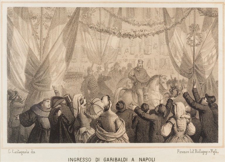 La stampa raffigura l'ingresso di Garibaldi a Napoli.