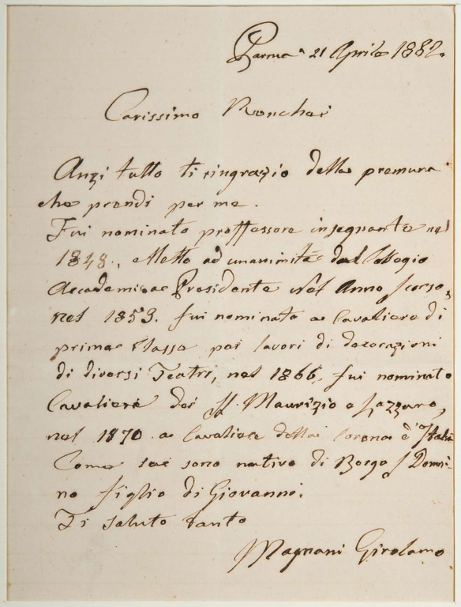 Manoscritto di Magnani che, rivolgendosi ad Amos Ronchey, enumera i riconoscimenti ottenuti durante la sua carriera di scenografo.
