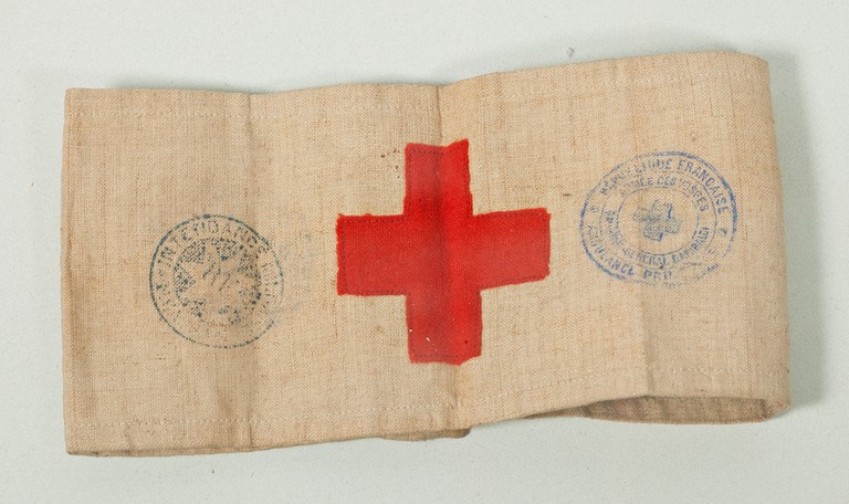 Bracciale di stoffa bianca, con croce rossa e due timbri dell'armata dei Vosgi.