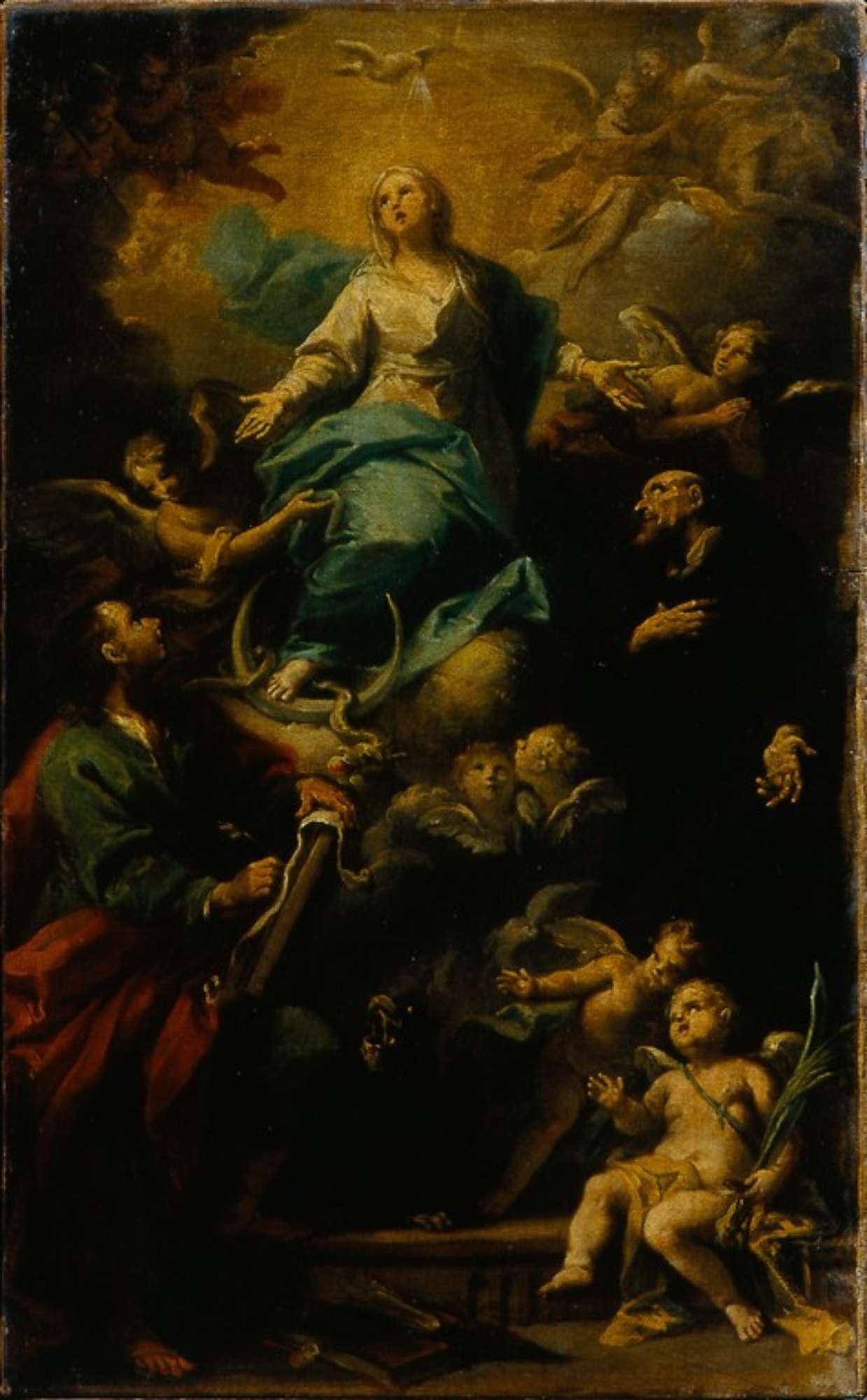 L’opera pervenne al Museo con un incomprensibile riferimento a Ludovico Lana. E stato riferito a Bertuzzi (PERUZZI 1980) per quegli esiti di vivace sintassi e di fresca esecuzione in punta di pennello che il pittore anconetano, meno a suo agio nella grande decorazione, riesce a raggiungere nelle opere di piccolo o minimo formato. Molto probabilmente il dipinto, bozzetto per una pala ancora non individuata, è da riferire al settimo decennio del Settecento: nella garbata eleganza delle immagini, ordita con agile segno e leggera tessitura di colore, si può ravvisare il medesimo punto di stile delle minute figure che popolano molti paesaggi a tempera del Lodi, con il quale Bertuzzi collaborò in più occasioni (ROLI 1977, pp. 124-125). Un confronto ancora più probante è stato ravvisato con le otto tele raffiguranti Storie della vita della Vergine che l’anno di consacrazione della Rotonda Caprara di Crevalcore, per le quali vennero dipinte (CASSOLI 1979, p. 18 nota 3), consente di datare a ridosso del 1768. Non v’è dubbio che proprio in questo settimo decennio del secolo la pittura dell’Anconitano, orientata verso un gentilissimo e frizzante barocchetto, venga crescendo di modernità; certe impeccabili arie bigariane, filtrate dal sofisticato e piacevole neo-manierismo del Monti, si tingono di spunti cromatici veneziani che attestano il rinnovato rapporto con il barocco lagunare, forse in parte provocato dalle aperture dei Gandolfi, e del resto ben vivo a Bologna fin dagli anni del Burrini e del Gionima.