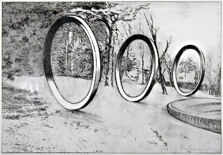 I tre giganteschi circoli in cemento, singolare connubio tra pesantezza e leggerezza, sono collocati quasi in bilico nel parco di palazzo Giorgi (della Resistenza) a Santa Sofia.