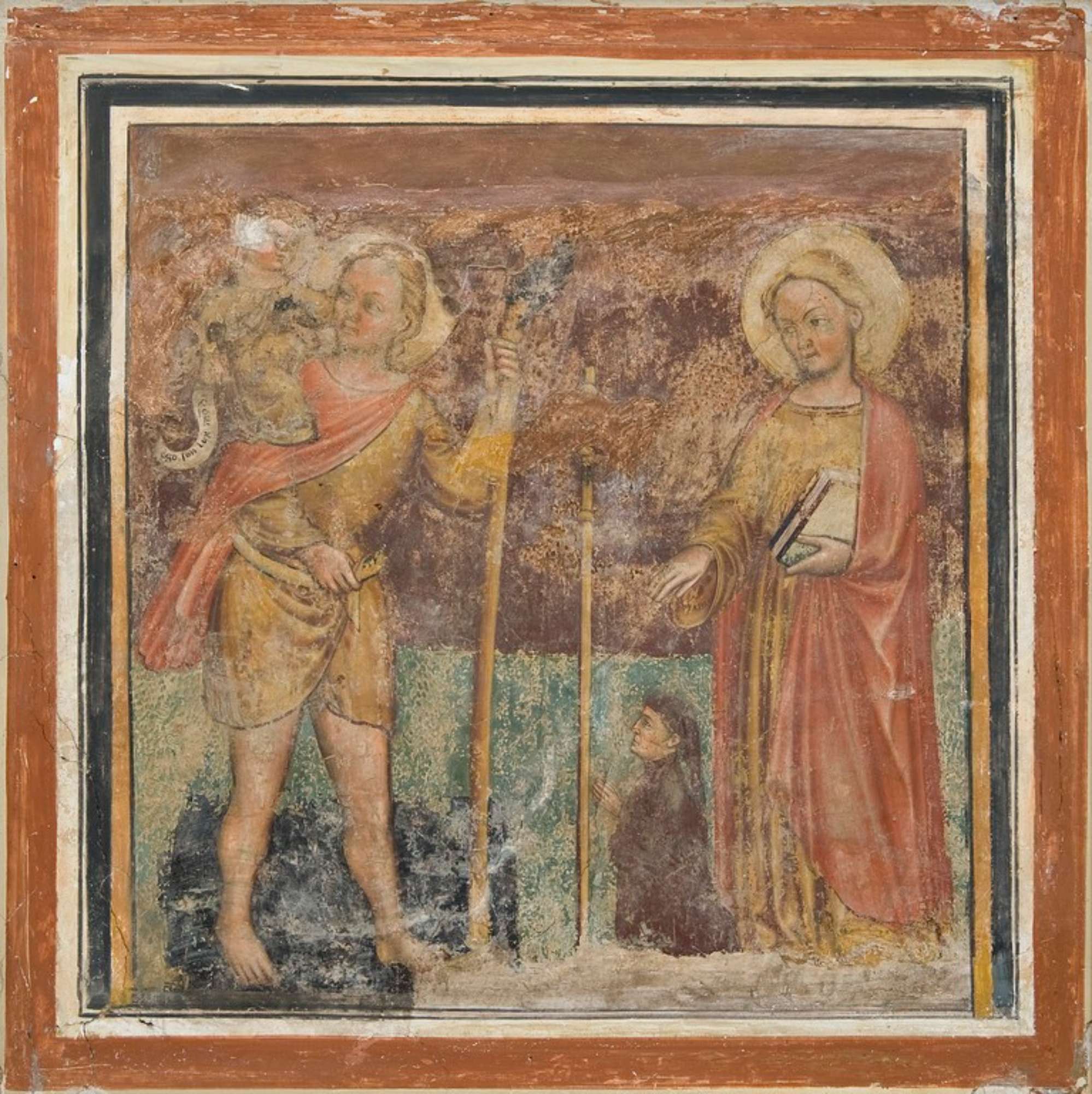 Incorniciato da una rozza cornice dipinta a fasce, sono rappresentati i Santi Cristoforo e Giacomo, tra i più cari alla devozione trecentesca in quanto legati al culto dei pellegrini e alla fondazione di quegli ospedali, che nel Medioevo erano luoghi di rifugio e di sosta oltre che di cura lungo i difficili percorsi stradali.